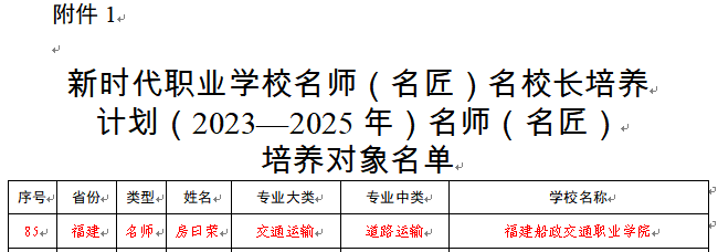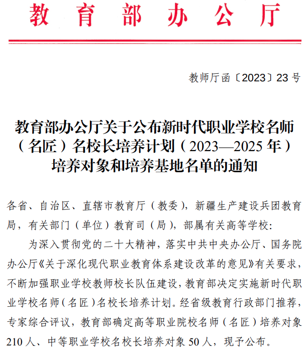 近日,教育部辦公廳下發(fā)《關(guān)于公布新時(shí)代職業(yè)學(xué)校名師(名匠)名校長培養(yǎng)計(jì)劃(2023—2025年)培養(yǎng)對象和培養(yǎng)基地名單的通知》,確定高等職業(yè)院校名師(名匠)培養(yǎng)對象210人、中等職業(yè)學(xué)校名校長培養(yǎng)對象50人。我院房曰榮教授入選為高等職業(yè)院校名師培養(yǎng)對象。