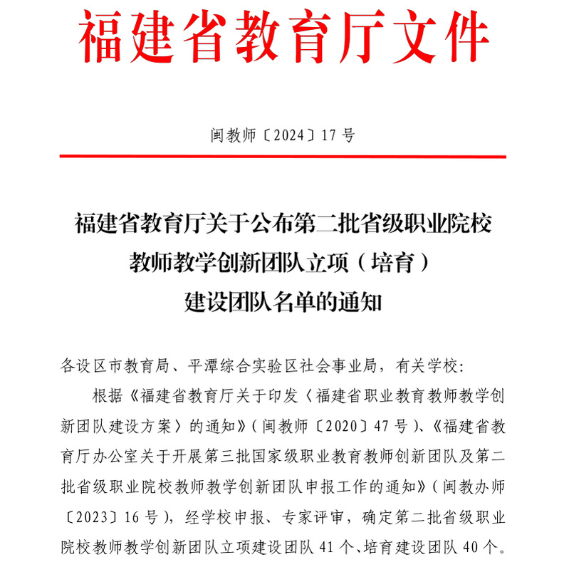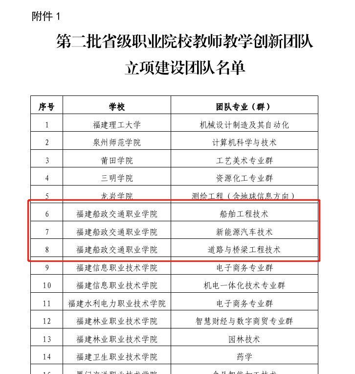 近日,福建省教育廳印發(fā)《關(guān)于公布第二批省級職業(yè)院校教師教學(xué)創(chuàng)新團隊立項(培育)建設(shè)團隊名單的通知》,確定第二批省級職業(yè)院校教師教學(xué)創(chuàng)新團隊立項建設(shè)團隊41個、培育建設(shè)團隊40個。我院船舶工程技術(shù)、新能源汽車技術(shù)、道路與橋梁工程技術(shù)等三個團隊入選省級職業(yè)院校教師教學(xué)創(chuàng)新團隊立項建設(shè)團隊。