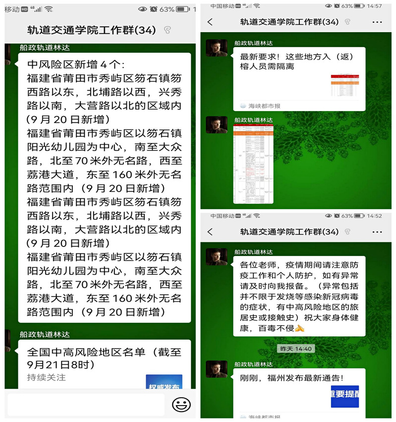 軌道交通學(xué)院第三黨支部黨員先鋒突擊隊(duì)充分利用學(xué)院QQ群、微信群等信息化手段,發(fā)布疫情防控簡訊和通知,及時(shí)調(diào)度提醒,加強(qiáng)對政策措施的宣傳解讀,確保疫情信息上下暢通、左右共享,構(gòu)建以預(yù)防為主、防治結(jié)合的防控工作長效管理與應(yīng)急處理機(jī)制,引導(dǎo)學(xué)院師生正確判斷疫情形勢,確保有效應(yīng)對各種突發(fā)情況,增強(qiáng)戰(zhàn)勝疫情的信心。