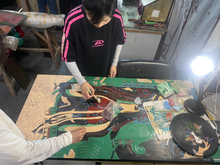 胡文平先生是漆器領(lǐng)域的知名藝術(shù)家,其漆器作品匠心獨(dú)運(yùn)、工藝精湛,深受?chē)?guó)內(nèi)外收藏家的喜愛(ài)。在他的工作室,我院學(xué)生們被各式各樣的漆器作品所吸引,無(wú)論是栩栩如生的花鳥(niǎo)蟲(chóng)魚(yú),還是氣韻生動(dòng)的山水人物,都展現(xiàn)出了漆器藝術(shù)的獨(dú)特魅力。