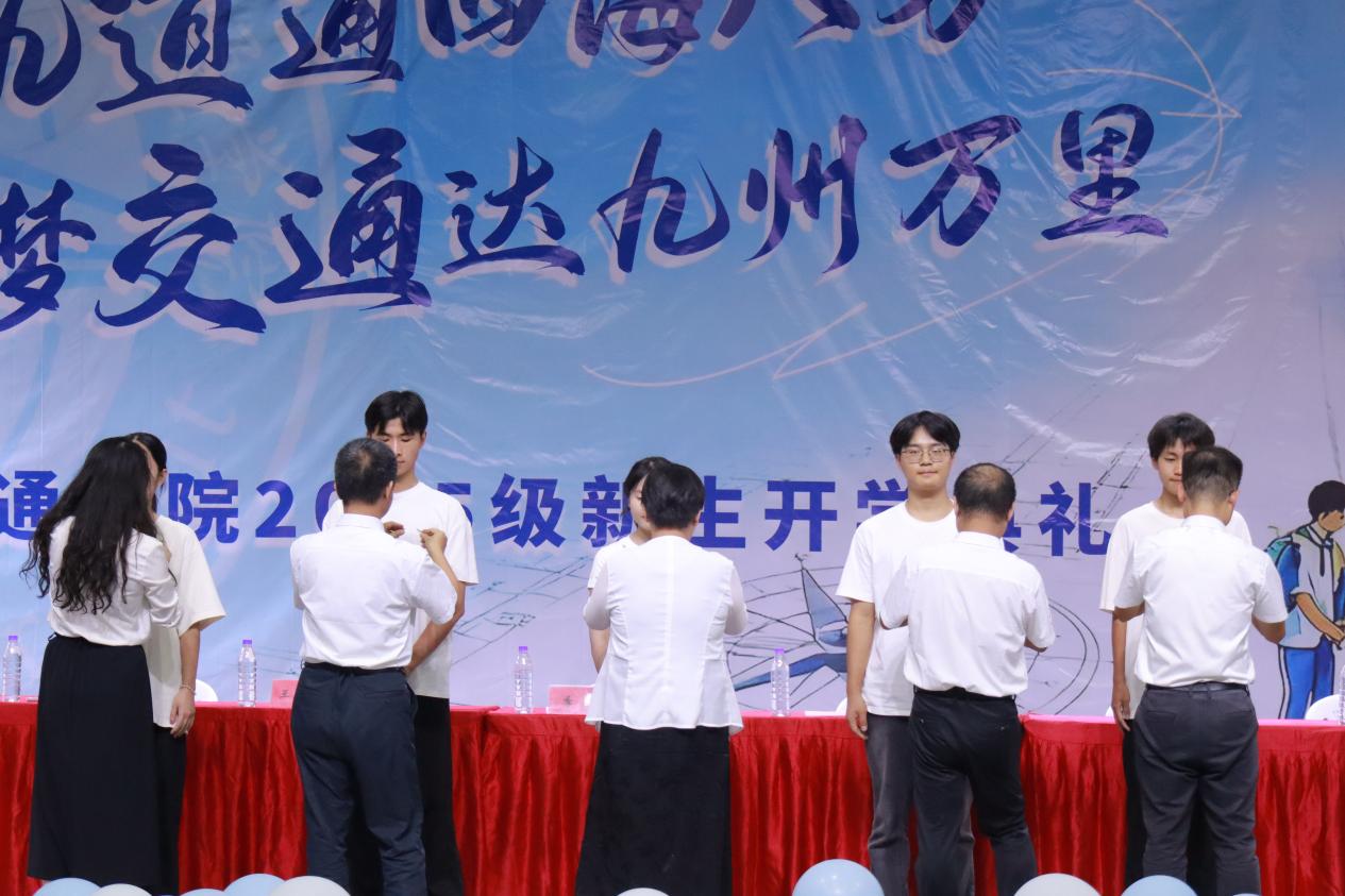 典禮現(xiàn)場(chǎng)最動(dòng)人的環(huán)節(jié)到來。學(xué)院領(lǐng)導(dǎo)與教師代表們手持校徽,逐一為新生佩戴。當(dāng)小小的校徽別在胸前,不僅是身份的象征,更承載著“傳承船政精神、深耕軌道事業(yè)”的期許。新生們輕輕撫摸徽章,眼中滿是激動(dòng)與堅(jiān)定——從這一刻起,他們正式以“船政人”的身份,開啟逐夢(mèng)之旅。