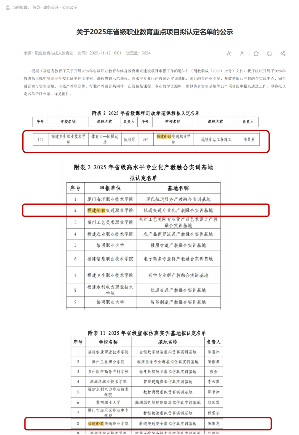 近日,福建省教育廳公布2025年省級職業(yè)教育重點項目擬認定名單,軌道交通學院共有3個重點項目入圍。其中,陳天炎院長牽頭負責的《軌道交通專業(yè)化產(chǎn)教融合實訓基地》被認定為2025年省級高水平專業(yè)化產(chǎn)教融合實訓基地;陳宏意副院長牽頭負責的《軌道交通安全虛擬仿真實訓基地》被認定為2025年省級虛擬仿真實訓基地;陳景煦博士負責的《地鐵車站工程施工》被認定為2025年省級課程思政示范課程。