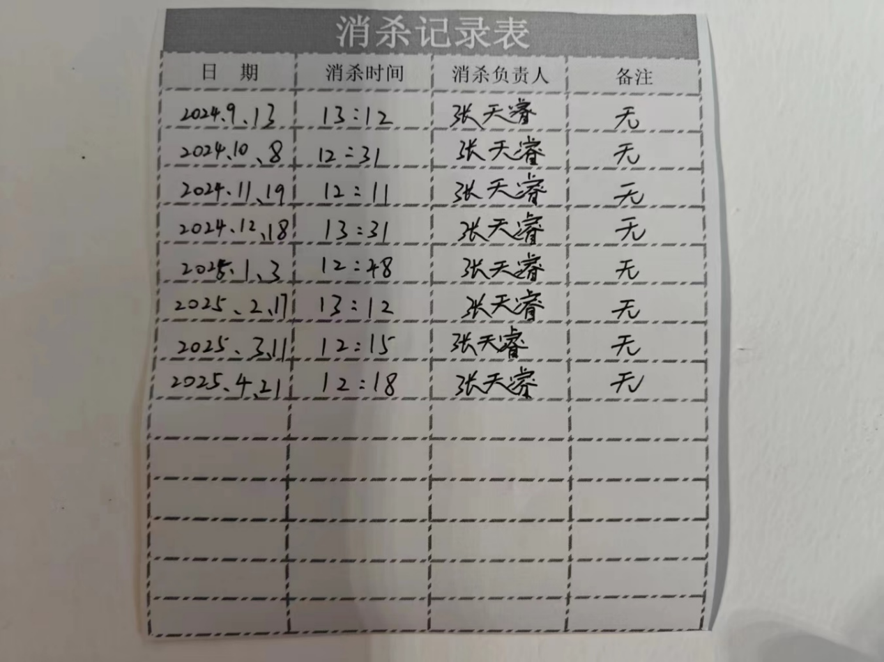每次消殺完成后,志愿者們都會認真填寫詳細的記錄表,注明消殺日期、責任人、消毒劑濃度和作業(yè)時間。這些記錄表被張貼在每臺洗衣機旁的醒目位置,同學們可以隨時查看,了解最新消殺情況。這種開放式管理贏得了同學們的信任,也讓服務過程始終處于監(jiān)督之下。