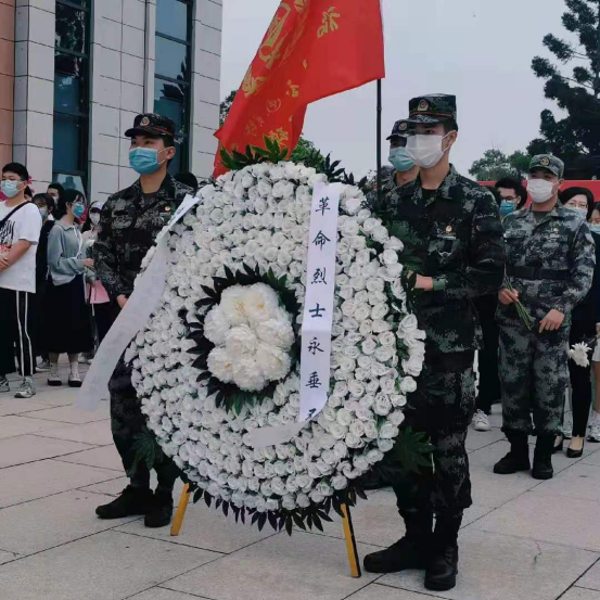 全體師生莊嚴肅立,在紀念碑前默哀致敬,為革命先烈敬獻花籃和鮮花,向革命烈士致以崇高的敬意,表達深切悼念和緬懷之情。