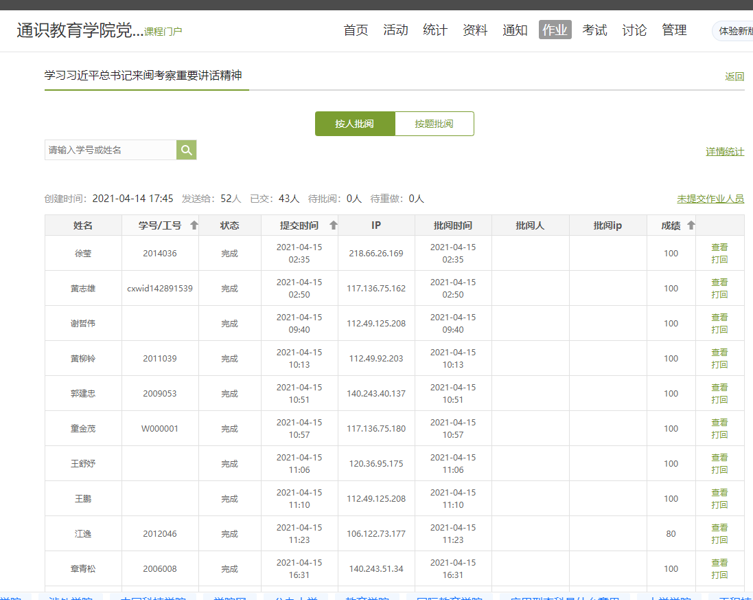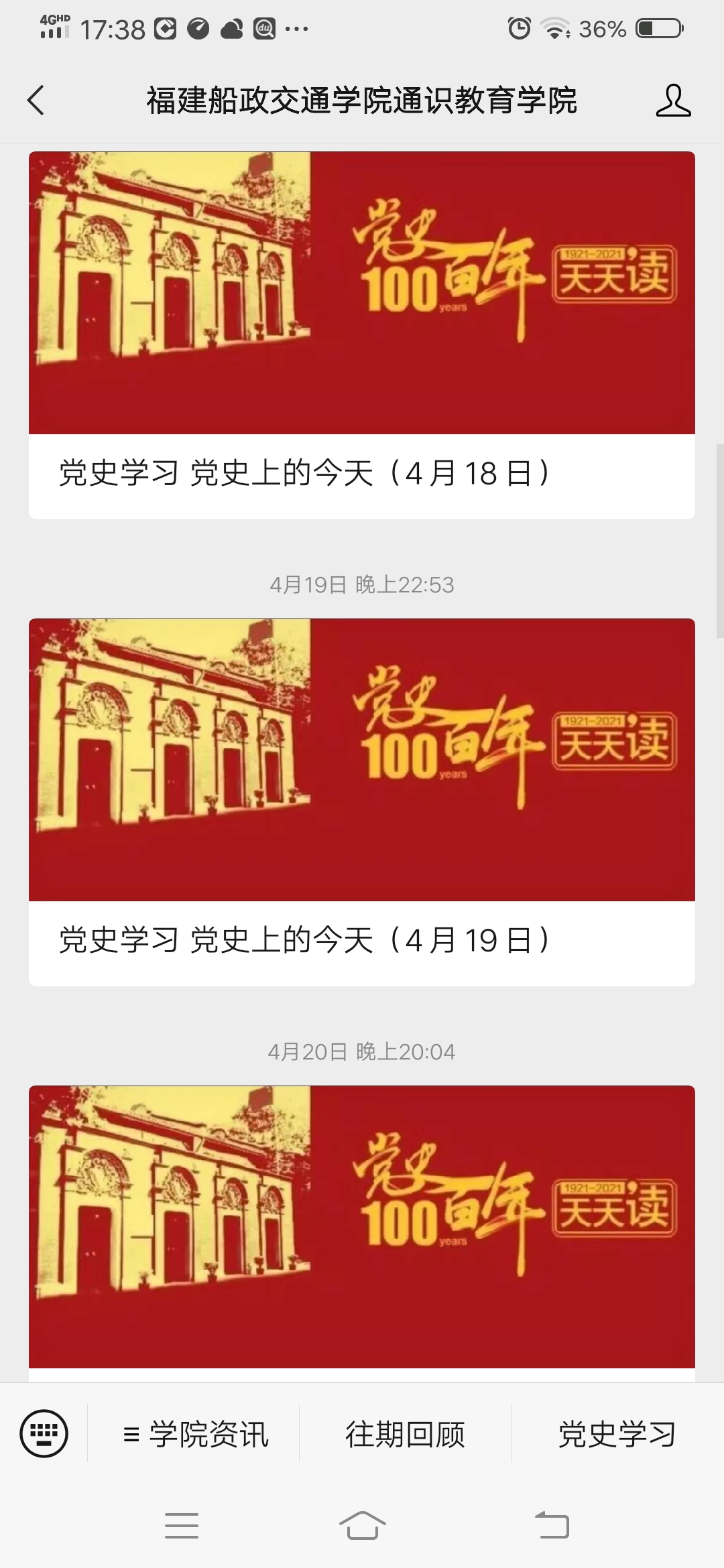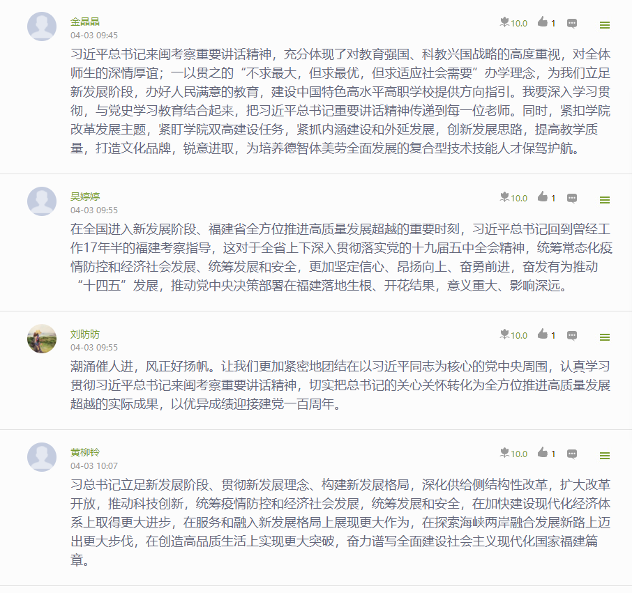 通識(shí)教育學(xué)院黨總支創(chuàng)新黨史學(xué)習(xí)教育形式,利用“學(xué)習(xí)通”線上黨建平臺(tái)的討論和作業(yè)等模塊,開(kāi)展黨史學(xué)習(xí)教育,以及黨史和習(xí)近平總書(shū)記來(lái)閩考察重要講話精神應(yīng)知應(yīng)會(huì)線上測(cè)試,增強(qiáng)學(xué)習(xí)實(shí)效。同時(shí),每日在網(wǎng)頁(yè)和微信公眾號(hào)上推送“黨史上的今天”和黨史學(xué)習(xí)相關(guān)內(nèi)容,通報(bào)總支黨員前日總支“學(xué)習(xí)強(qiáng)國(guó)”積分情況,督促每位教師認(rèn)真學(xué)習(xí)。