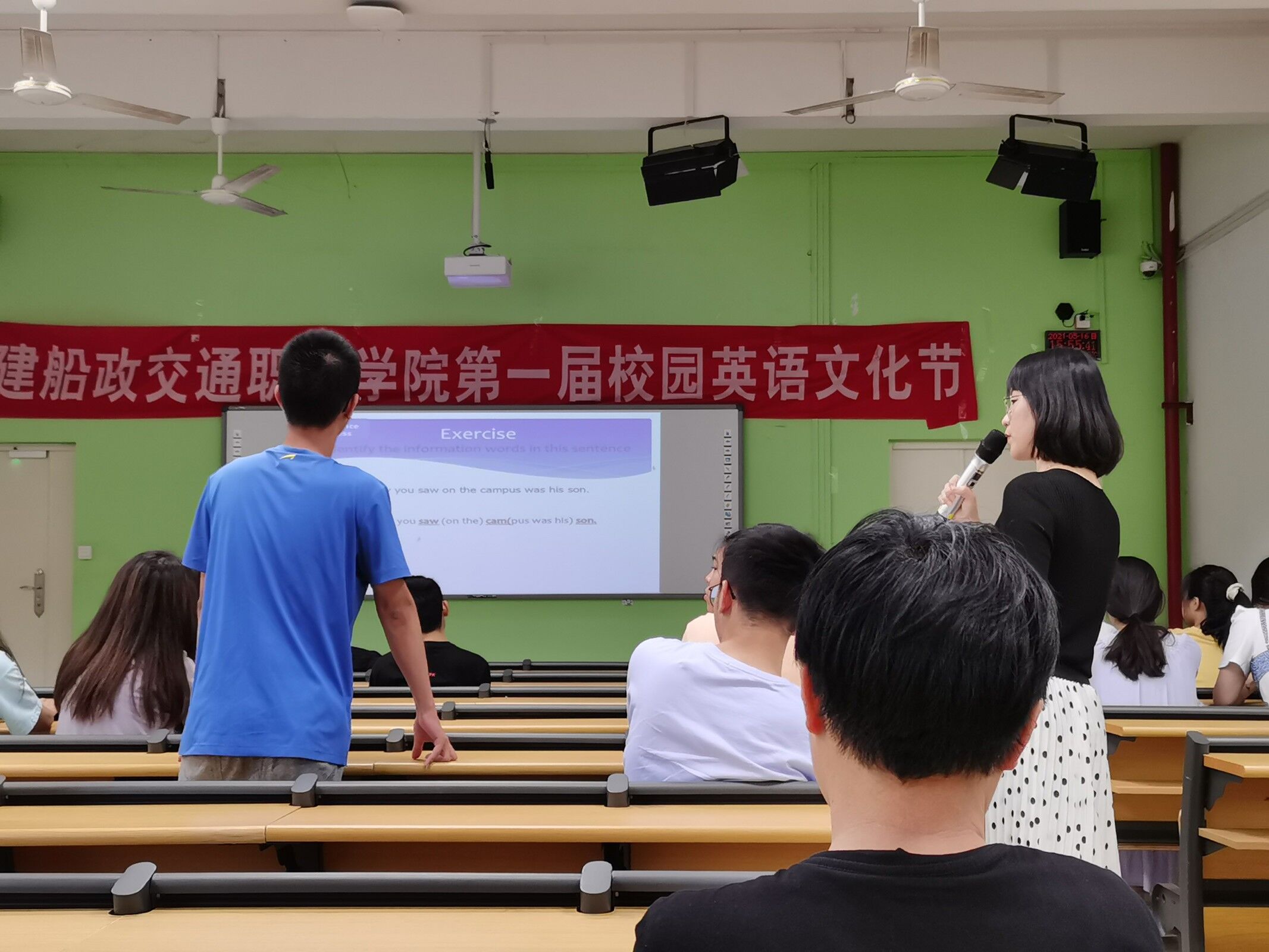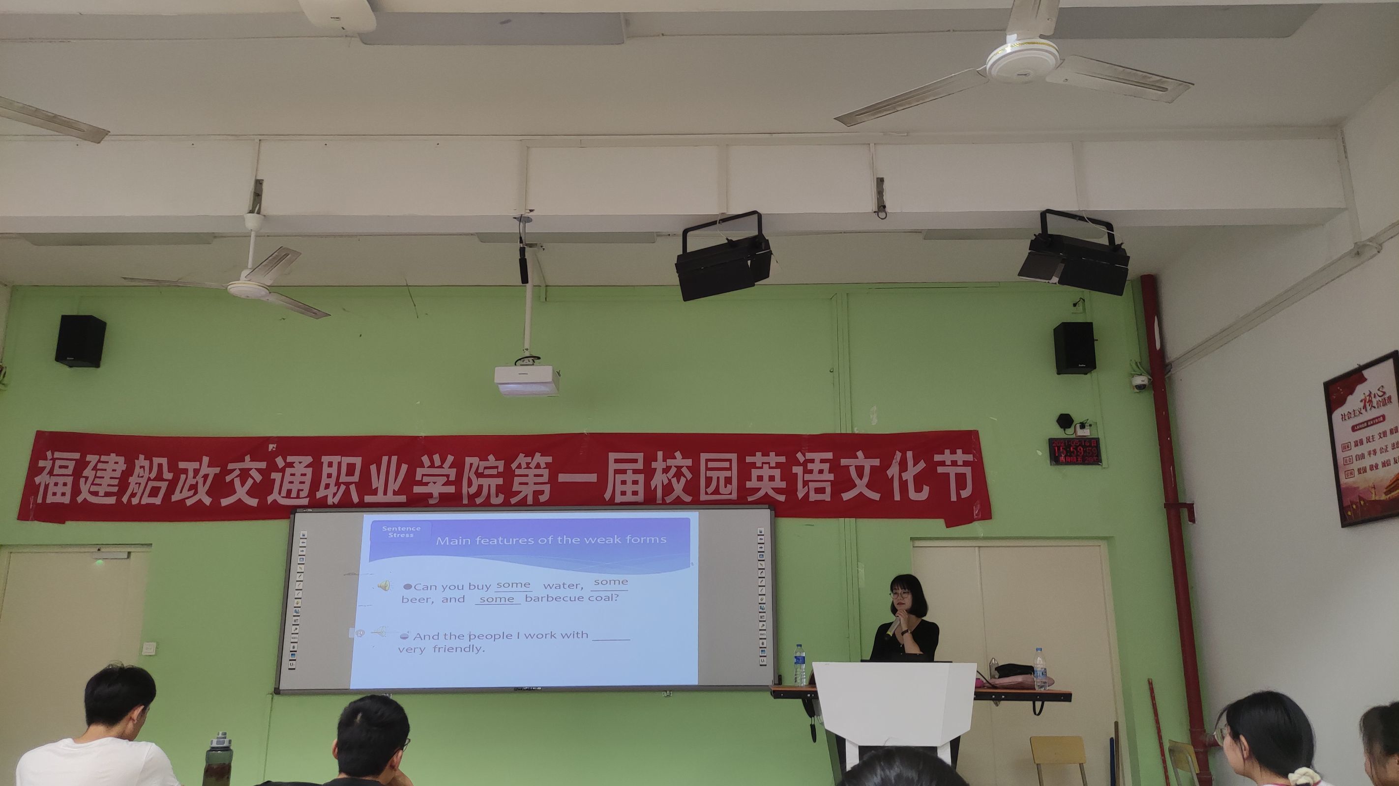 講座現(xiàn)場的同學們都對英語語音知識充滿了好奇,因為這是他們之前未曾專門細究過的英語學習內(nèi)容。老師在講座中先是播放各地不同英語口音的視頻來切入正題,介紹不同國家都有各自不同的語音腔調(diào),接著又分析了我們說英語時所帶有的中國口音的特點,以及該通過什么樣的練習方式讓英語變得更地道。同學們對這個話題都很感興趣,現(xiàn)場笑聲頻頻,師生互動熱烈,反響很好。