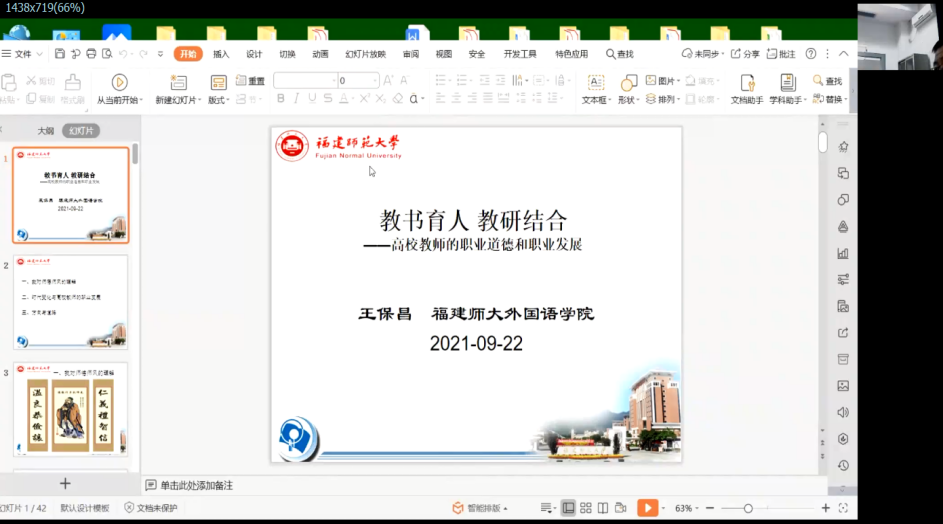 9月22日下午,福建師范大學外國語學院王保昌老師以“教書育人 教研結合——高校教師的職業(yè)道德和職業(yè)發(fā)展”為題開展師德師風專題培訓,分享對教師職業(yè)的理解,闡明高校教師師德師風建設的重要性,從時代變化分析高校教師職業(yè)發(fā)展中的機遇與挑戰(zhàn),提出發(fā)展方向、道路等工作建議,既要做到“學高為師,身正為范”,具備有高超的教育教學能力,更要有高尚的人格品質,爭做“四有”好老師、當好“四個引路人”、實現“四個相統(tǒng)一”。最后,王老師建議,高校教師要結合教學工作開展教學研究,以教學研究帶動教學工作,實現二者融合發(fā)展。