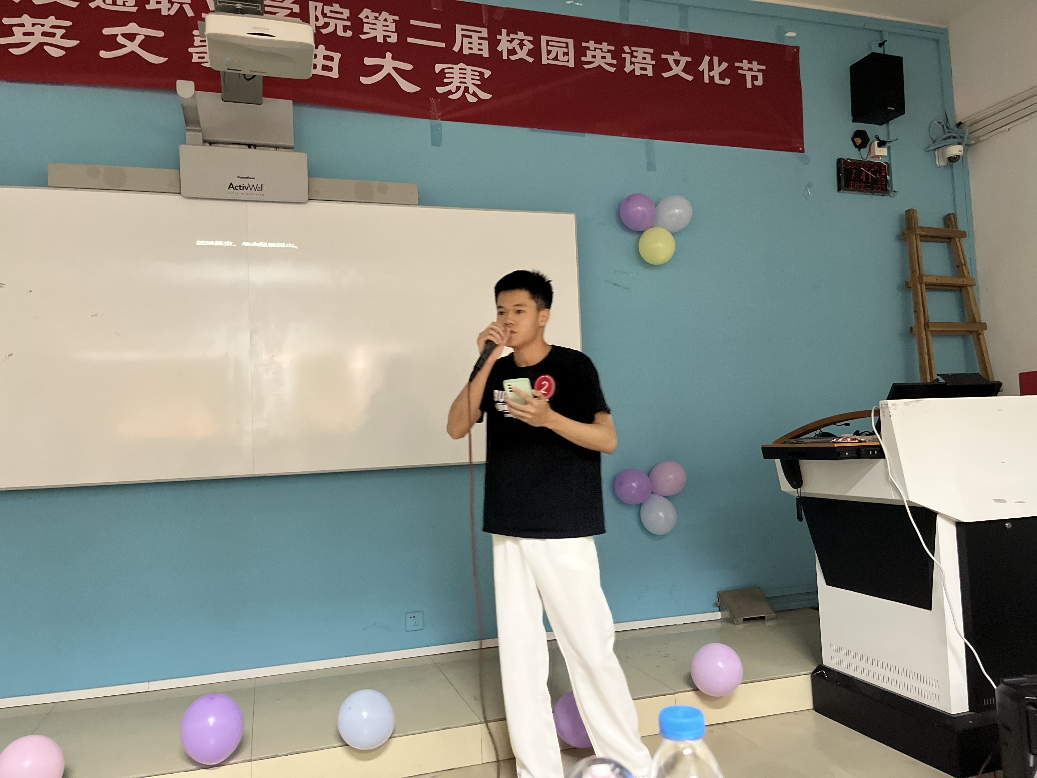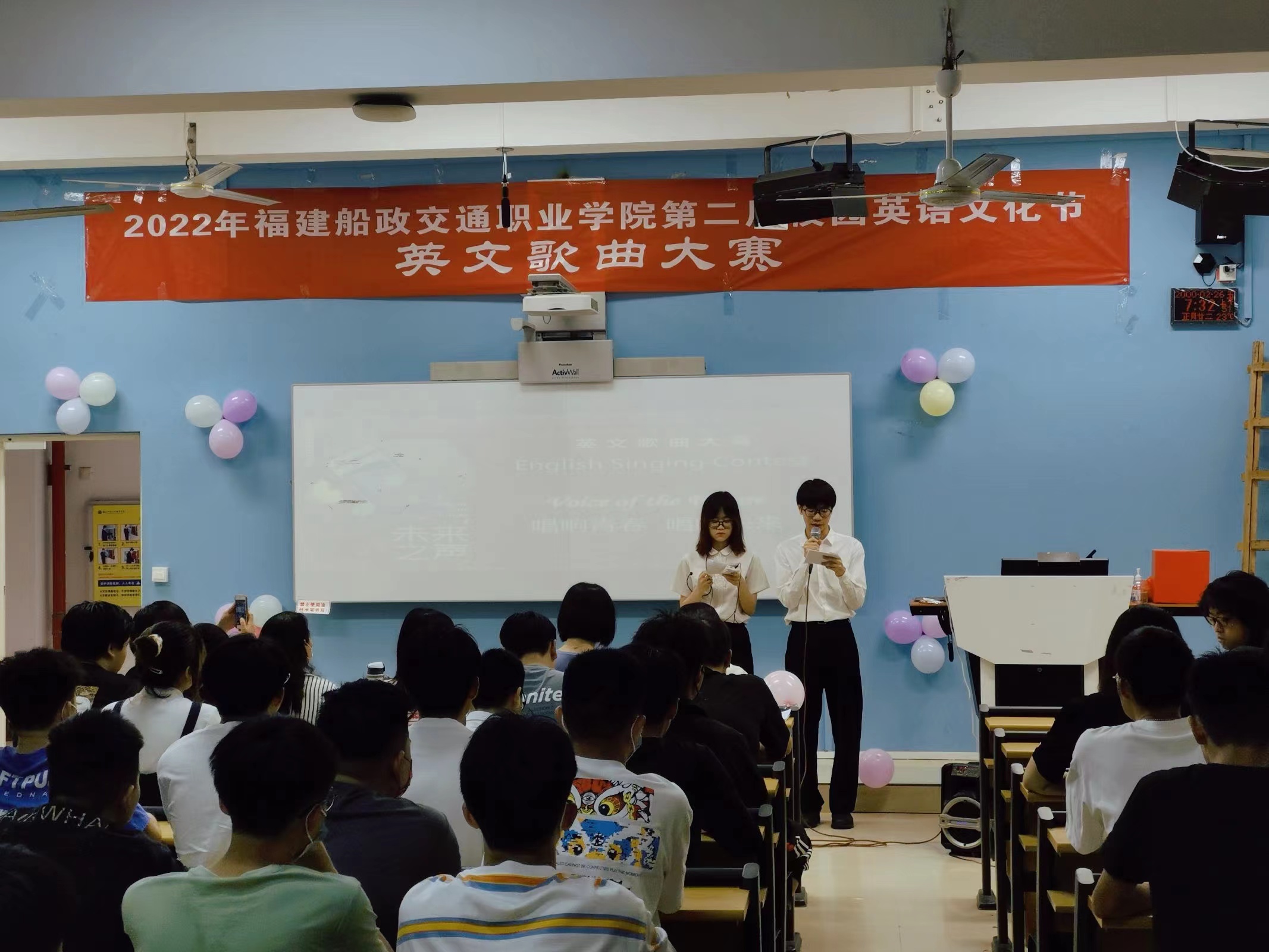 4月23日下午,第二屆校園英語文化節(jié)系列活動之“Voice of the Future”英文歌曲比賽決賽在北區(qū)2號樓2-2教室成功舉辦。經(jīng)過前期初賽選拔,共有11名選手參與本次決賽獎項(xiàng)的角逐。本次大賽由我院英語教研室章素蘋主任、梁華蓉教授、連海寧老師、吳菲菲老師、謝慧老師擔(dān)任評委,由20電子商務(wù)5班李圣杰和李晴同學(xué)主持。