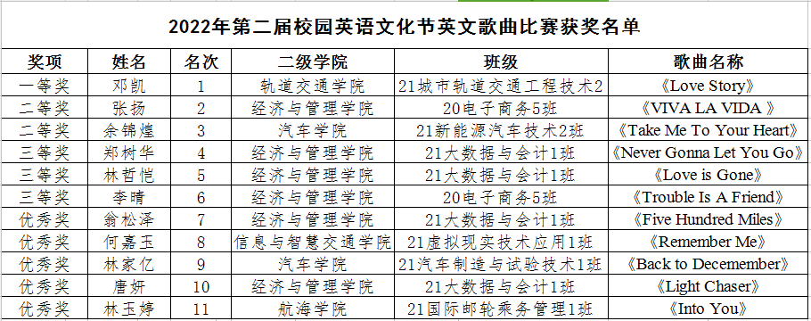 本次英文歌曲大賽進(jìn)一步提高了學(xué)生英語學(xué)習(xí)興趣,增強(qiáng)自主學(xué)習(xí)英語的意識,豐富校園英語文化,為同學(xué)們提供了一個展示自我英語水平和青春靚麗風(fēng)采的平臺,真正實(shí)現(xiàn)“唱響青春、唱響未來”。