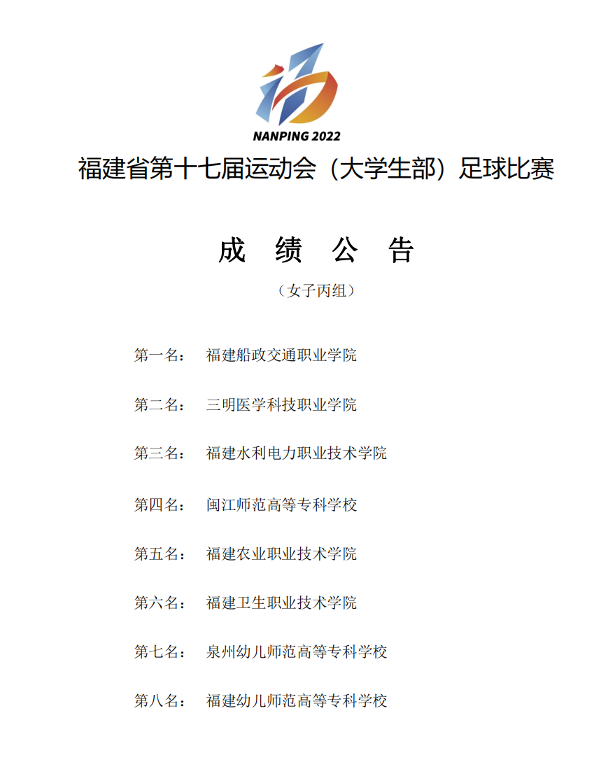 7月20日晚,福建省第十七屆運動會(大學生部女子丙組)足球比賽在福建省青少年校園足球基地、福建船政交通職業(yè)學院圓滿落幕,該組別共有來自全省8支高職院校代表隊參賽。