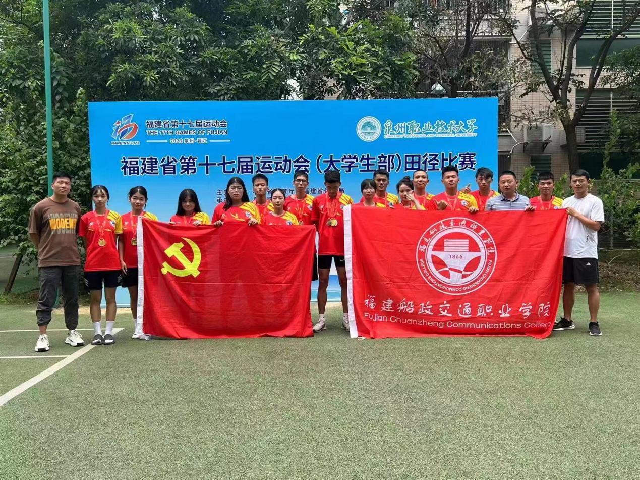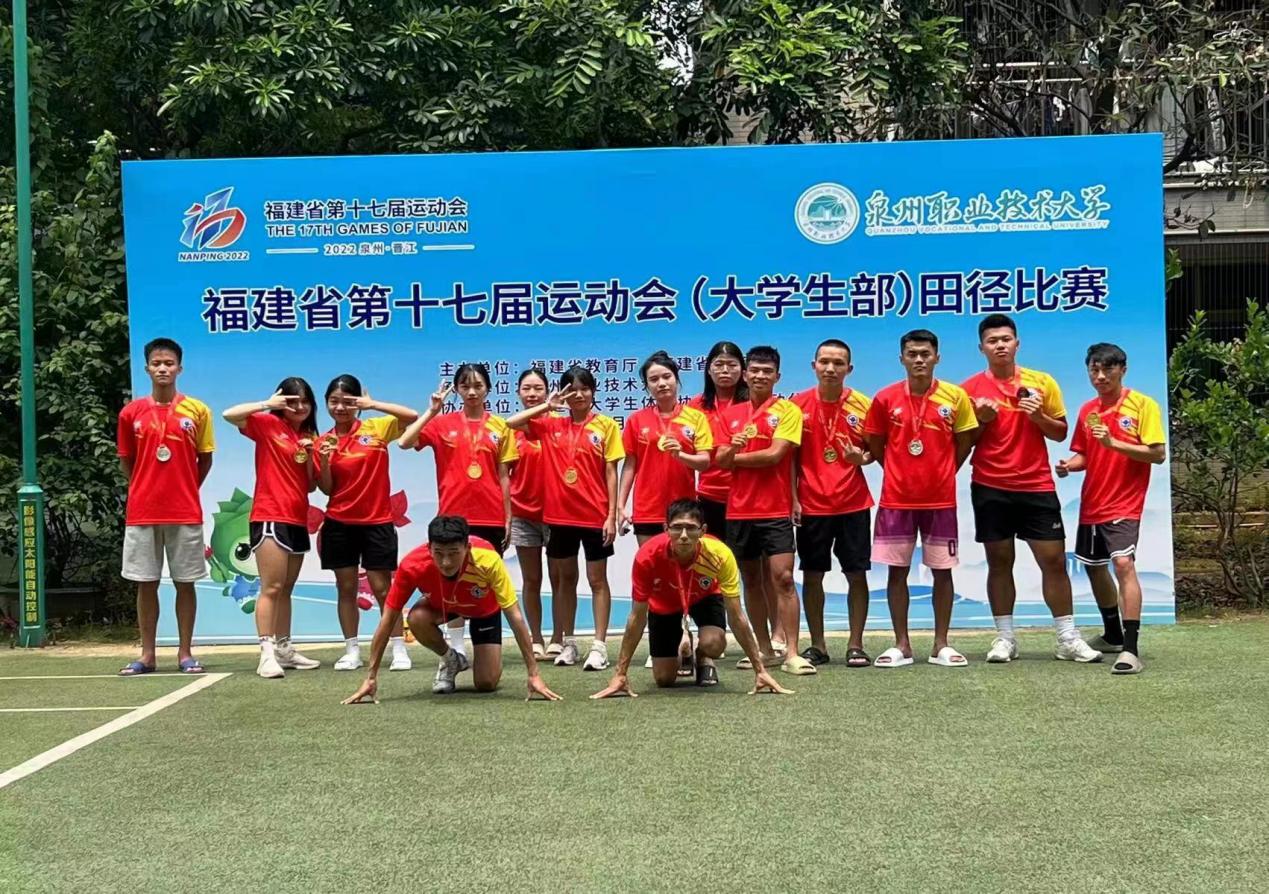 2022年7月31日——8月7日,福建省第十七屆運(yùn)動(dòng)會(huì)(大學(xué)生部)田徑比賽在泉州職業(yè)技術(shù)大學(xué)順利舉辦。此次比賽由福建省教育廳、福建省體育局主辦,共吸引來自省內(nèi)80多所高校的1500多位運(yùn)動(dòng)健兒參賽。經(jīng)過激烈角逐,我院田徑隊(duì)分別在丙組男子100米、200米、跳高、跳遠(yuǎn)、800米、鐵餅、1500米和5000米,女子100米、鉛球、鐵餅等項(xiàng)目斬金奪銀,以10金3銀3銅,改寫5項(xiàng)賽會(huì)記錄,以222分的優(yōu)異成績(jī)榮獲丙組團(tuán)體總分第一。