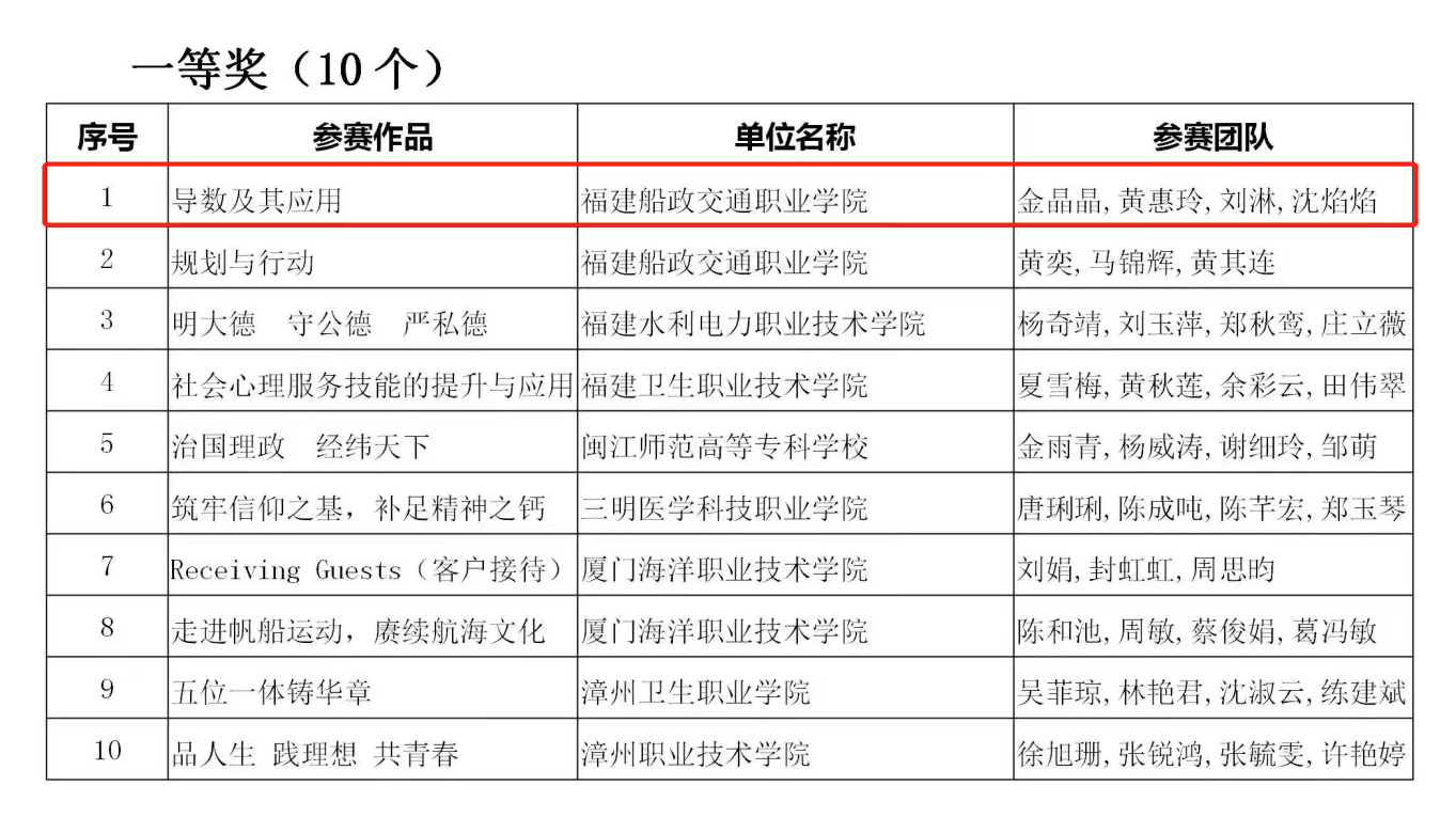 日前,省教育廳公布了2022年福建省職業(yè)院校技能大賽教學(xué)能力比賽獲獎(jiǎng)名單,我院數(shù)學(xué)教學(xué)參賽隊(duì)(金晶晶、劉淋、沈焰焰、黃惠玲)的《導(dǎo)數(shù)及其應(yīng)用》作品榮獲一等獎(jiǎng)。