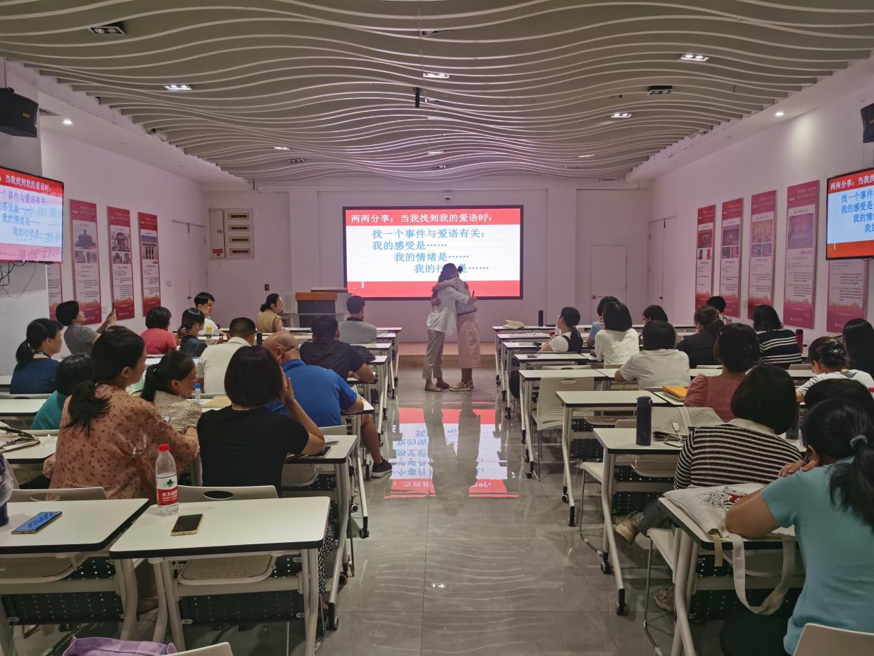 課上,李榕輝老師從教師心理健康出發(fā),結(jié)合生動(dòng)的案例和自身經(jīng)歷,介紹家庭親子溝通的重要性、意義和途徑,重點(diǎn)闡述了肯定的言詞、精心的時(shí)刻、接受禮物、服務(wù)的行動(dòng)和身體的接觸等“愛(ài)的五種語(yǔ)言”,以及具體表達(dá)方式?,F(xiàn)場(chǎng)氣氛活躍,李榕輝開展多次互動(dòng)游戲、測(cè)試、冥想母愛(ài)之光等活動(dòng),有效教師們打開良好溝通之門,提高與家人溝通的質(zhì)量。老師們紛紛表示,培訓(xùn)課氛圍感好,實(shí)用性強(qiáng),工作離不開家庭,離不開良好的親子關(guān)系,從培訓(xùn)課中學(xué)會(huì)了實(shí)用親子表達(dá)溝通的方式和技巧。