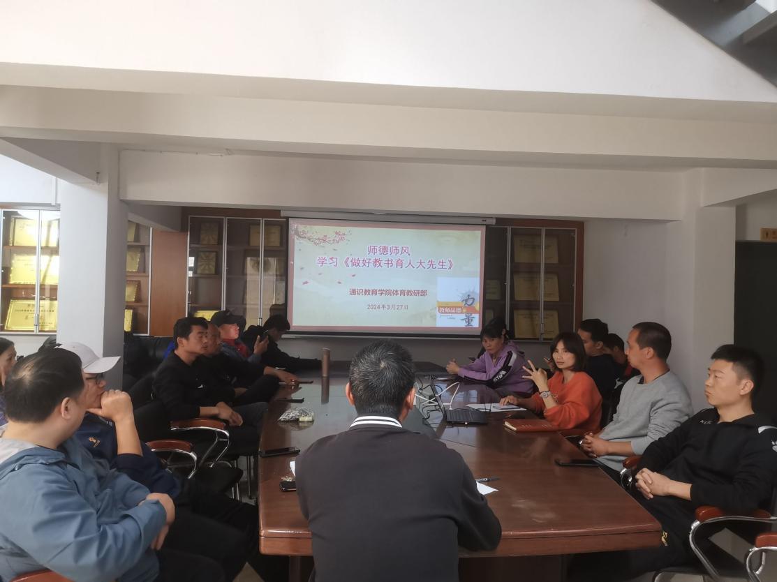3月27日下午,通識教育學院各教研室組織學習《中華人民共和國愛國主義教育法》、《事業(yè)單位工作人員處分規(guī)定》和《做好教書育人大先生》,引導全體教師提高個人綜合素質,夯實教育教學基本功,進一步加強新時代愛國主義教育,傳承和弘揚愛國主義精神。
