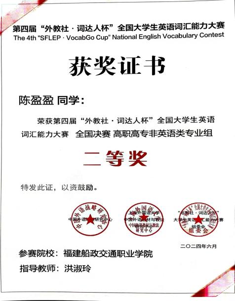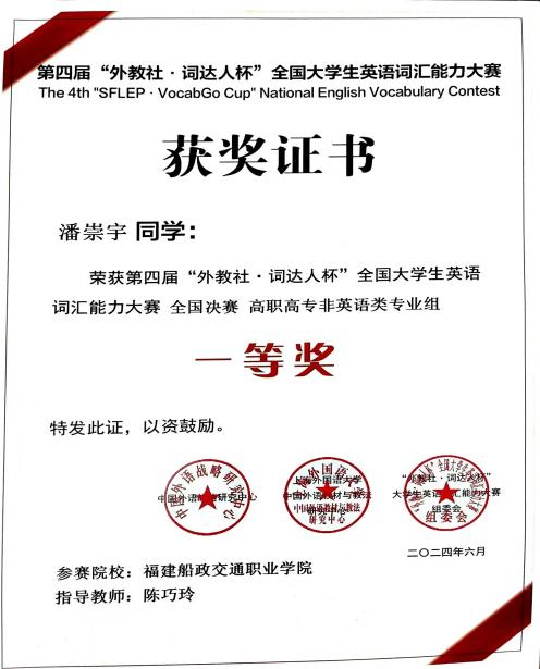 中國外語戰(zhàn)略研究中心、中國外語教材與教法研究中心和上海外語教育出版社于2024年3月-5月聯(lián)合啟動(dòng)了第四屆“外教社·詞達(dá)人杯”全國大學(xué)生英語詞匯能力大賽。我校共有547名選手報(bào)名參賽,其中54位選手晉級(jí)省賽。其中,4月16日舉行的省賽中。我校4位選手分別獲得省一、二、三等獎(jiǎng),潘崇宇和陳瑩瑩同學(xué)代表我校參加了5月25日舉行的全國總決賽并分別獲得全國決賽一、二等獎(jiǎng)。