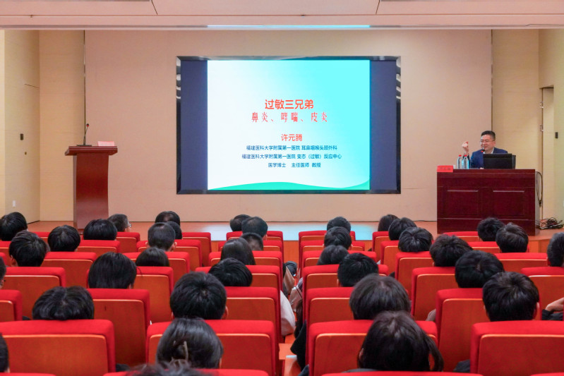 本次活動學院邀請了福建醫(yī)科大學附屬第一醫(yī)院醫(yī)學博士、著名耳鼻咽喉-頭頸外科/過敏中心主任許元騰教授進校開展《過敏三兄弟-鼻炎、哮喘與皮炎》科普知識講座。許教授以深入淺出的方式,詳細講解了過敏性鼻炎、哮喘和皮炎等常見過敏性疾病的成因、癥狀及預防方法,并強調(diào)過敏性疾病并不可怕,關鍵在于提高認識,科學防治。講座現(xiàn)場互動氣氛熱烈,師生們紛紛表示受益匪淺。