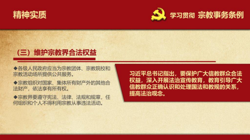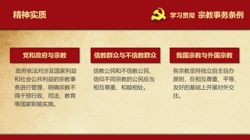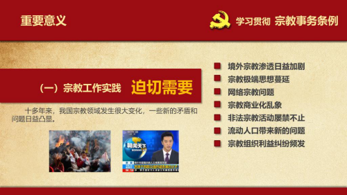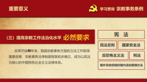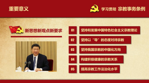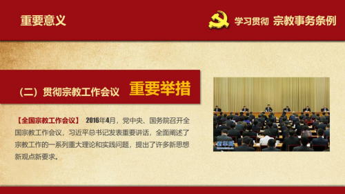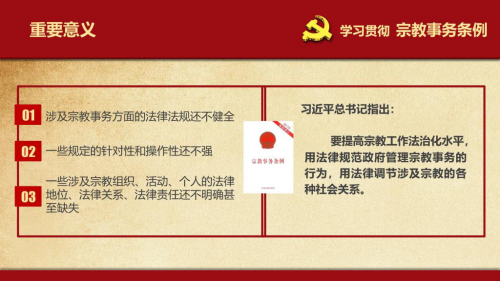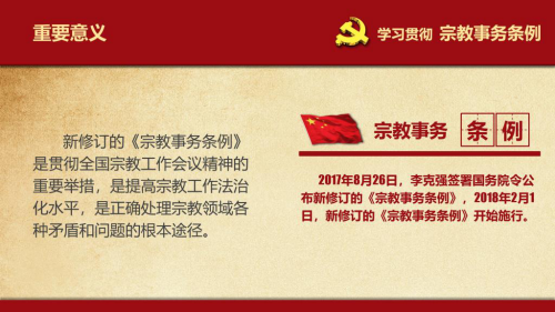 黨的十八大以來,以習(xí)近平同志為核心的黨中央高度重視宗教工作,將宗教工作擺上更加重要的議事日程。2016年,黨中央、國務(wù)院召開全國宗教工作會議,習(xí)近平總書記發(fā)表了重要講話,從黨和國家事業(yè)發(fā)展全局的戰(zhàn)略高度,科學(xué)分析了宗教工作面臨的形勢和任務(wù),就宗教問題和宗教工作提出了一系列新思想新觀點新要求,為加強和改進新形勢下的宗教工作指明了方向、提供了遵循。 新修訂的《宗教事務(wù)條例》于2018年2月1日正式實施。出臺新修訂的《條例》,是貫徹全國宗教工作會議精神的重要舉措,對推進我國宗教工作法治化進程具有十分重要的意義。 |