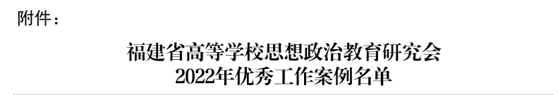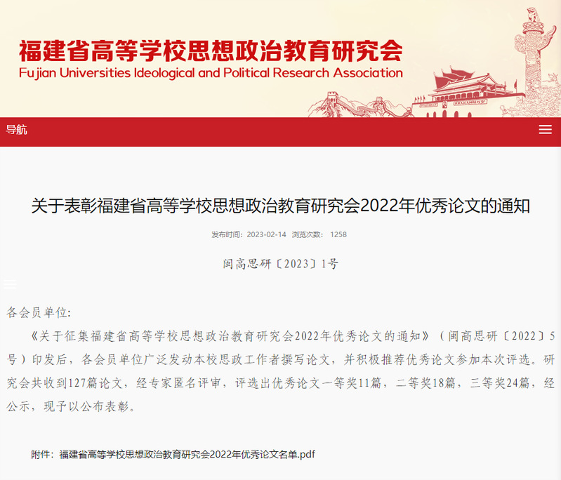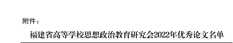 日前,福建省高等學(xué)校思想政治教育研究會(huì)公布了2022年優(yōu)秀論文和優(yōu)秀工作案例結(jié)果,我校獲得優(yōu)秀論文二等獎(jiǎng)1項(xiàng),優(yōu)秀工作案例三等獎(jiǎng)1項(xiàng)。