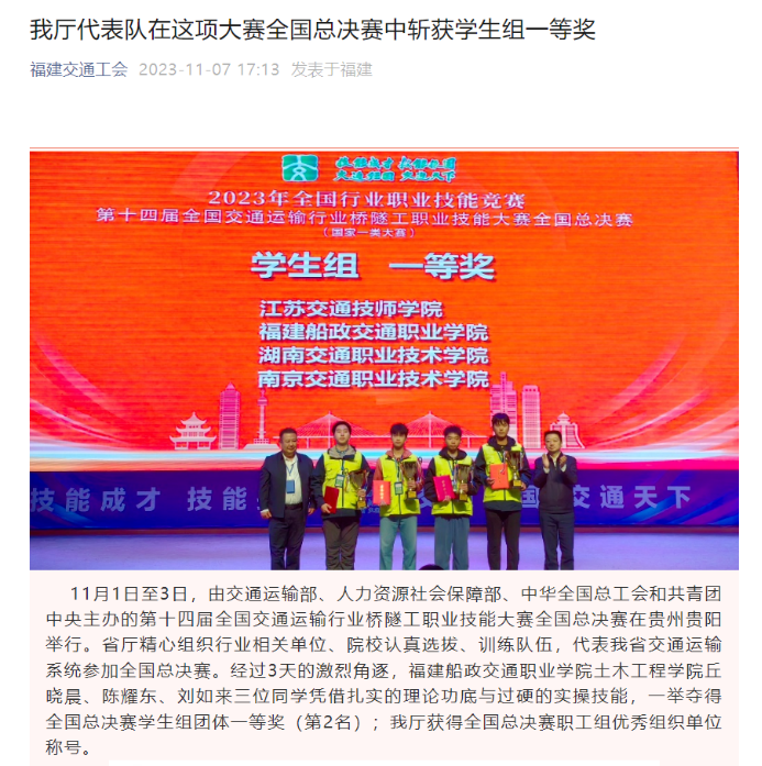 日前,福建交通工會報道了我省在2023年全國行業(yè)職業(yè)技能競賽——第十四屆全國交通運輸行業(yè)橋隧工職業(yè)技能大賽全國總決賽(國家一類大賽)中獲獎情況。作為我省交通運輸系統(tǒng)代表隊,我院獲全國總決賽學生組團體一等獎(第2名),充分展示了我院培養(yǎng)交通運輸高素質技能人才的有效成果,為全面加快建設交通強省提供了堅強的后備人才保障。