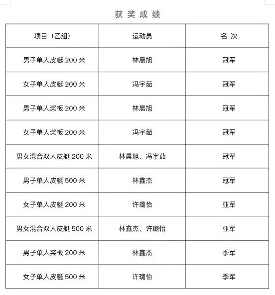 學(xué)院水上運(yùn)動隊(duì)首度亮相中國大學(xué)生皮劃艇錦標(biāo)賽,參加高職高專組(乙組)比賽,隊(duì)員們奮力拼搏,展現(xiàn)出了良好的競技狀態(tài),最終獲得6金2銀2銅的佳績。我校代表隊(duì)代還獲得體育道德風(fēng)尚獎、林杰獲得優(yōu)秀教練員稱號、林晨旭獲得優(yōu)秀運(yùn)動員稱號。