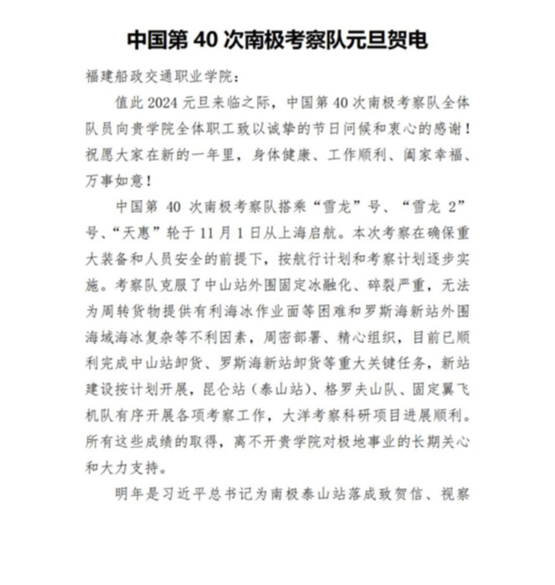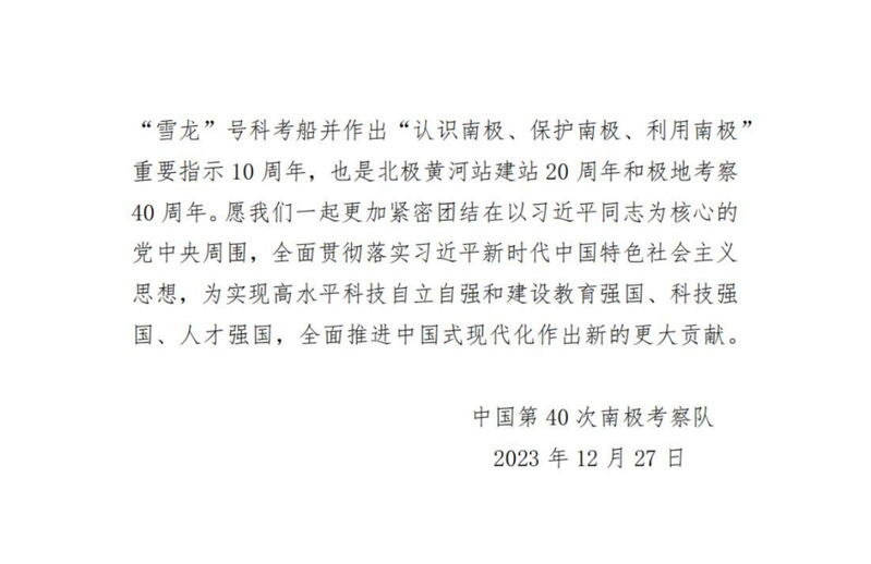 近日,我院收到中國第40次南極科學考察隊發(fā)來的元旦賀電。遠在南極執(zhí)行考察任務的中國第40次南極科學考察隊全體隊員向我院全體職工致以誠摯的節(jié)日問候,向我院對極地事業(yè)的長期支持和大力關(guān)心表示衷心的感謝。