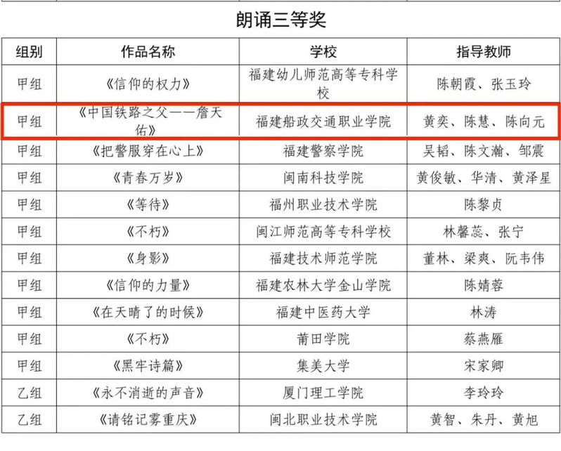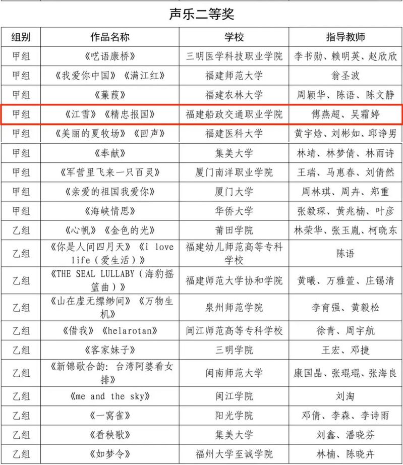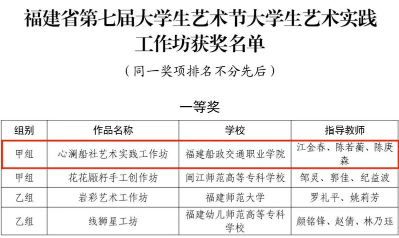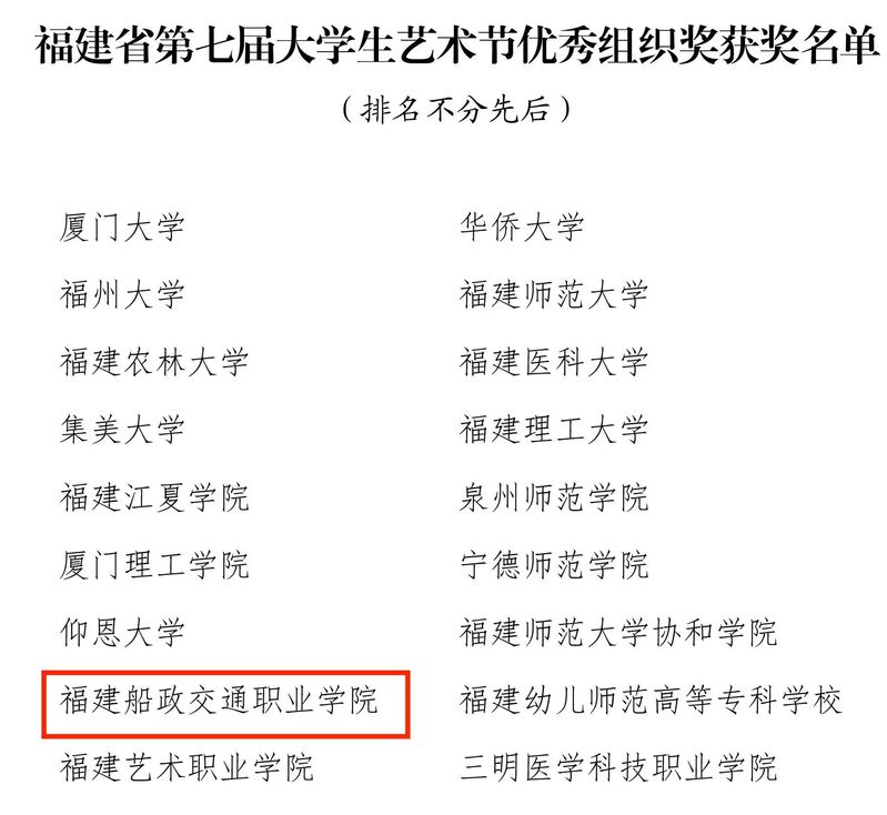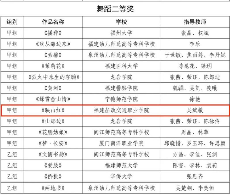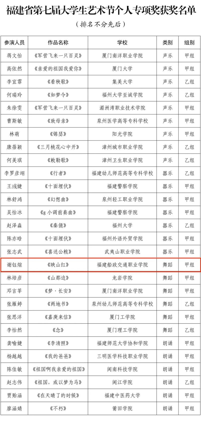福建省第七屆大學(xué)生藝術(shù)節(jié)展演活動(dòng)獲獎(jiǎng)名單近日公布。大藝展由福建省教育廳主辦,三年舉辦一次,本屆藝術(shù)節(jié)以“厚植家國(guó)情懷,涵養(yǎng)進(jìn)取品格”為主題。我院精心準(zhǔn)備,選送了4個(gè)項(xiàng)目參加福建省第七屆大學(xué)生藝術(shù)節(jié)展演,斬獲6項(xiàng)榮譽(yù),其中一等獎(jiǎng)1項(xiàng)并入圍國(guó)賽角逐,二等獎(jiǎng)2項(xiàng),三等獎(jiǎng)1項(xiàng),學(xué)院榮獲優(yōu)秀組織獎(jiǎng),1位學(xué)生獲個(gè)人專項(xiàng)獎(jiǎng)。