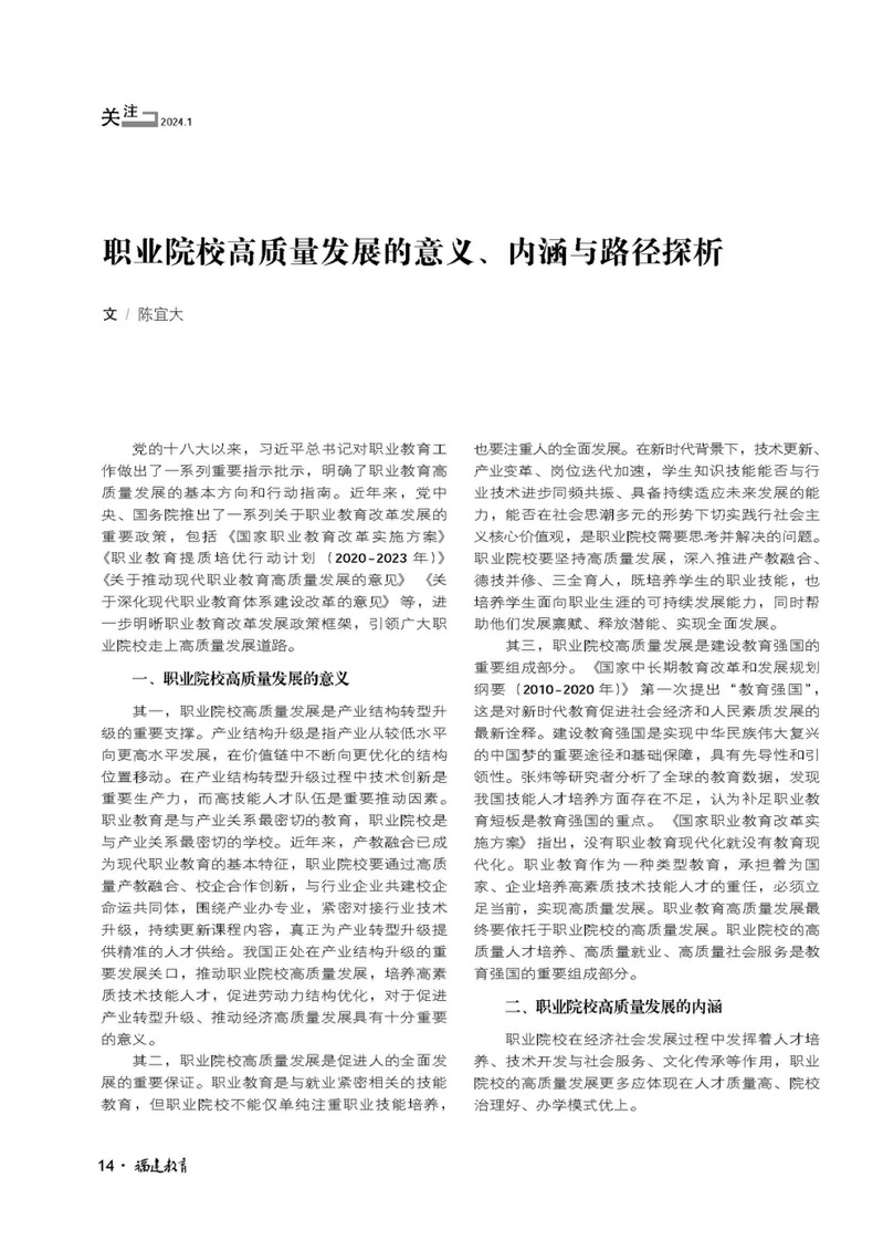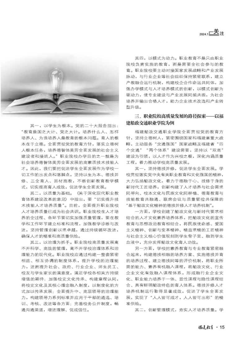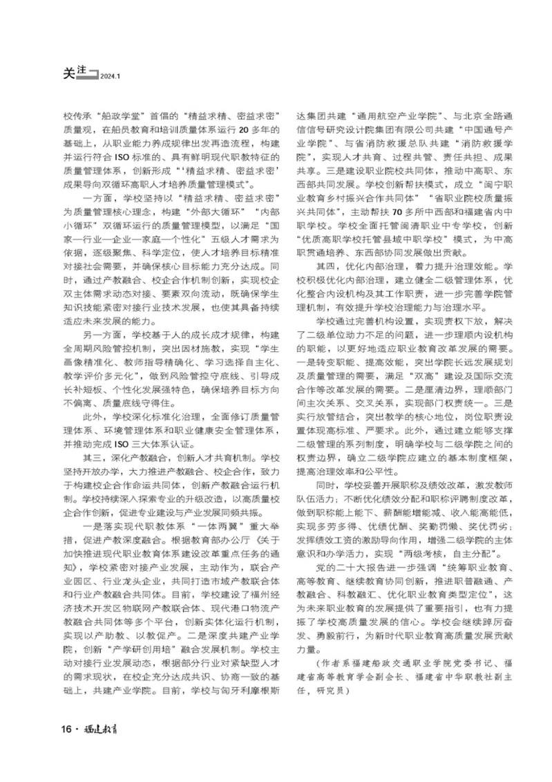 福建省教育廳主管、福建教育雜志社主辦的教育專業(yè)期刊《福建教育》2024年第4期“關(guān)注”職業(yè)教育高質(zhì)量發(fā)展筆談欄目,刊發(fā)了學(xué)院黨委書(shū)記陳宜大筆談文章,對(duì)職業(yè)教育高質(zhì)量發(fā)展的目標(biāo)、內(nèi)涵、路徑、策略等進(jìn)行深入探討,內(nèi)容如下: