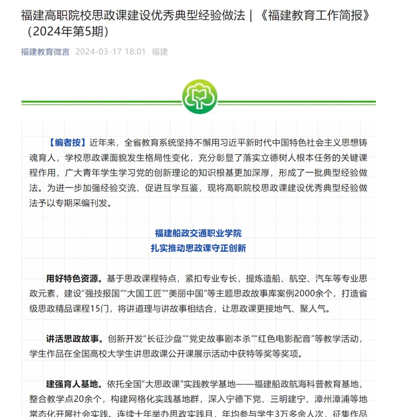 【編者按】近年來,全省教育系統(tǒng)堅持不懈用習近平新時代中國特色社會主義思想鑄魂育人,學校思政課面貌發(fā)生格局性變化,充分彰顯了落實立德樹人根本任務的關鍵課程作用,廣大青年學生學習黨的創(chuàng)新理論的知識根基更加深厚,形成了一批典型經(jīng)驗做法。為進一步加強經(jīng)驗交流、促進互學互鑒,現(xiàn)將高職院校思政課建設優(yōu)秀典型經(jīng)驗做法予以專期采編刊發(fā)。