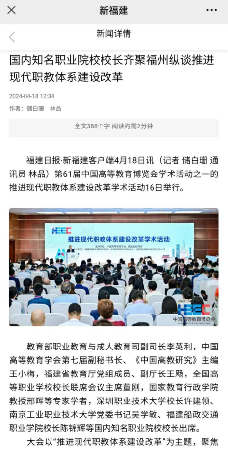 福建日報·新福建客戶端4月18日訊(記者 儲白珊 通訊員 林品)第61屆中國高等教育博覽會學術(shù)活動之一的推進現(xiàn)代職教體系建設(shè)改革學術(shù)活動16日舉行。