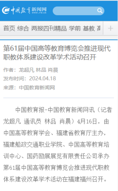 中國教育報-中國教育新聞網(wǎng)訊(記者 龍超凡 通訊員 林品 肖晨)4月16日,由中國高等教育學會、福建省教育廳主辦,福建船政交通職業(yè)學院、中國高等教育培訓中心、國藥勵展展覽有限責任公司承辦第61屆中國高等教育博覽會推進現(xiàn)代職教體系建設(shè)改革學術(shù)活動在福建福州召開。