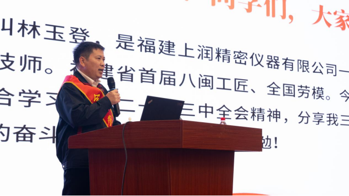 啟動(dòng)儀式后,全國(guó)勞動(dòng)模范、全國(guó)技術(shù)能手、享受國(guó)務(wù)院政府特殊津貼專家福建上潤(rùn)精密儀器有限公司林玉登分享他30年工作的艱辛歷程和生動(dòng)事跡。他三十年如一日認(rèn)真做好精密制造這一件事,“簡(jiǎn)單的事情重復(fù)做,重復(fù)的事情堅(jiān)持做”,他用堅(jiān)持不懈、永不放棄的精神為推動(dòng)福建傳統(tǒng)產(chǎn)業(yè)轉(zhuǎn)型升級(jí)和智能制造做出了積極貢獻(xiàn)。在場(chǎng)的觀眾都從林玉登勞模事跡中深刻感悟勞模精神、勞動(dòng)精神、工匠精神的實(shí)質(zhì)內(nèi)涵。