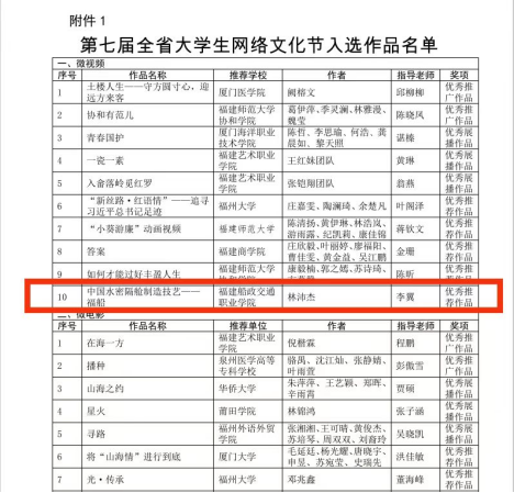 日前,中共福建省委教育工委、中共福建省委網(wǎng)信辦公布第七屆全省大學生網(wǎng)絡文化節(jié)和全省高校網(wǎng)絡教育優(yōu)秀作品推選展示活動獲獎結(jié)果。由我院航海學院林沛杰同學創(chuàng)作的微視頻《中國水密隔艙制造技藝——福船》獲微視頻類別“優(yōu)秀推薦作品”獎項。