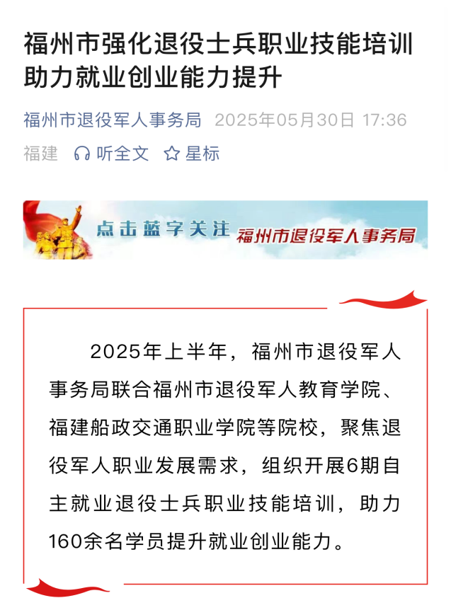 2025年上半年,福州市退役軍人事務(wù)局聯(lián)合福州市退役軍人教育學(xué)院、福建船政交通職業(yè)學(xué)院等院校,聚焦退役軍人職業(yè)發(fā)展需求,組織開(kāi)展6期自主就業(yè)退役士兵職業(yè)技能培訓(xùn),助力160余名學(xué)員提升就業(yè)創(chuàng)業(yè)能力。
