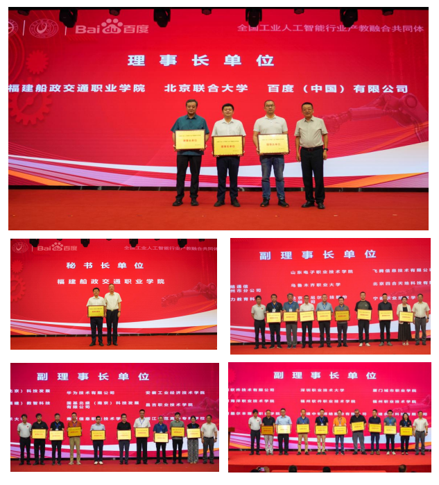 大會(huì)現(xiàn)場舉行了理事長單位、副理事長單位、常務(wù)理事單位及理事單位授牌儀式,百度(中國)有限公司、北京聯(lián)合大學(xué)、福建船政交通職業(yè)學(xué)院榮膺理事長單位,福建船政交通職業(yè)學(xué)院當(dāng)選秘書長單位,并順利通過了《全國工業(yè)人工智能行業(yè)產(chǎn)教融合共同體章程》。