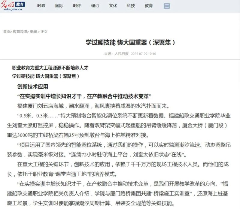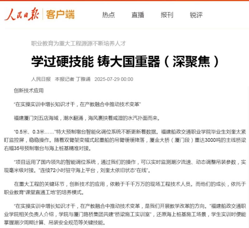 7月29日,人民網(wǎng)、新華網(wǎng)、光明網(wǎng)、中國網(wǎng)等中央主流媒體報道我院畢業(yè)生劉奎太參與廈金大橋(廈門段)建設(shè),展現(xiàn)學(xué)院在產(chǎn)教融合育人方面所取得的顯著成效。具體報道情況如下: