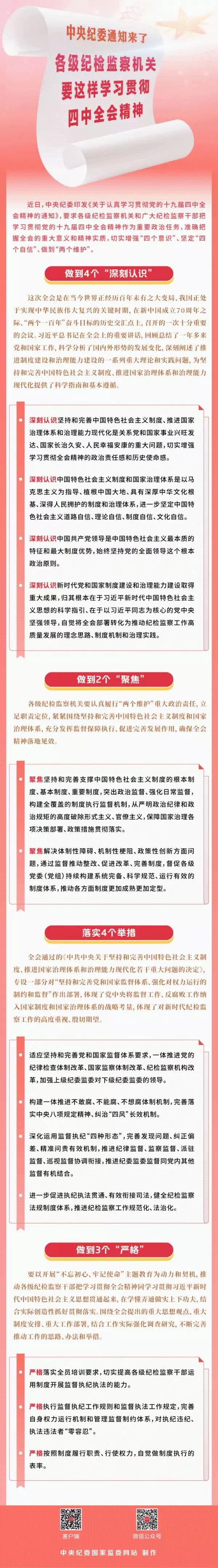 《通知》指出,全會(huì)通過(guò)的《中共中央關(guān)于堅(jiān)持和完善中國(guó)特色社會(huì)主義制度、推進(jìn)國(guó)家治理體系和治理能力現(xiàn)代化若干重大問題的決定》,專設(shè)一部分對(duì)“堅(jiān)持和完善黨和國(guó)家監(jiān)督體系、強(qiáng)化對(duì)權(quán)力運(yùn)行的制約和監(jiān)督”作出部署,體現(xiàn)了黨中央將監(jiān)督工作、反腐敗工作納入國(guó)家制度和國(guó)家治理體系的戰(zhàn)略考量,體現(xiàn)了對(duì)新時(shí)代紀(jì)檢監(jiān)察工作的高度重視、殷切期望。要適應(yīng)堅(jiān)持和完善黨和國(guó)家監(jiān)督體系要求,一體推進(jìn)黨的紀(jì)律檢查體制改革、國(guó)家監(jiān)察體制改革、紀(jì)檢監(jiān)察機(jī)構(gòu)改革,加強(qiáng)上級(jí)紀(jì)委監(jiān)委對(duì)下級(jí)紀(jì)委監(jiān)委的領(lǐng)導(dǎo);構(gòu)建一體推進(jìn)不敢腐、不能腐、不想腐體制機(jī)制,完善落實(shí)中央八項(xiàng)規(guī)定精神、糾治“四風(fēng)”長(zhǎng)效機(jī)制;深化運(yùn)用監(jiān)督執(zhí)紀(jì)“四種形態(tài)”,完善發(fā)現(xiàn)問題、糾正偏差、精準(zhǔn)問責(zé)有效機(jī)制,推進(jìn)紀(jì)律監(jiān)督、監(jiān)察監(jiān)督、派駐監(jiān)督、巡視監(jiān)督協(xié)調(diào)銜接,推進(jìn)紀(jì)委監(jiān)委監(jiān)督同黨內(nèi)其他監(jiān)督有機(jī)結(jié)合;進(jìn)一步促進(jìn)執(zhí)紀(jì)執(zhí)法貫通、有效銜接司法,健全紀(jì)檢監(jiān)察法規(guī)制度體系,推進(jìn)紀(jì)檢監(jiān)察工作規(guī)范化、法治化。