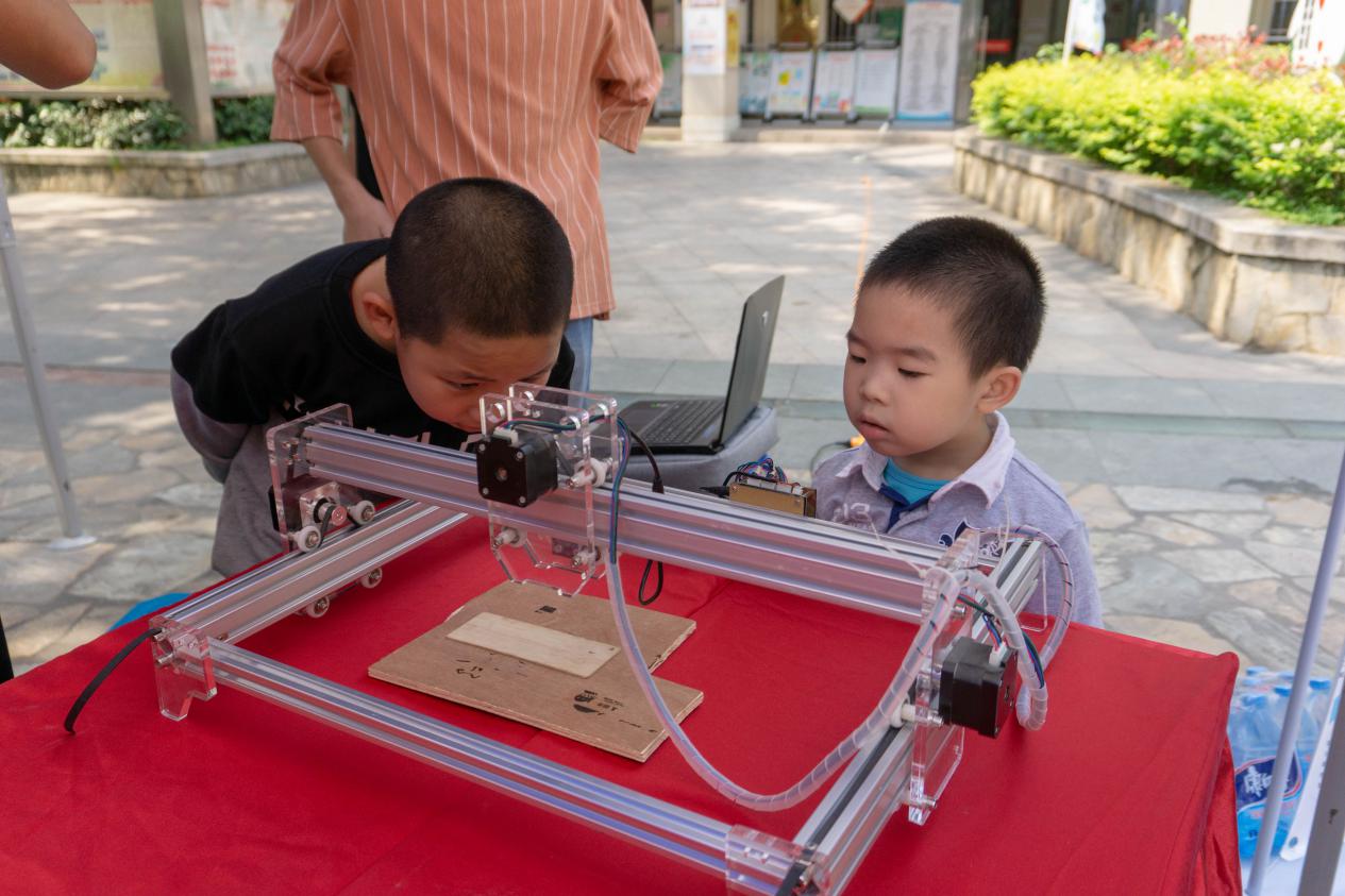 在蘭亭新天地社區(qū)廣場活動現(xiàn)場,機(jī)械系機(jī)器人協(xié)會的同學(xué)們向群眾展示了“機(jī)器人對抗小車”和“激光打印雕刻機(jī)”。同學(xué)們向現(xiàn)場的群眾和小朋友們現(xiàn)場演示、生動講解了“機(jī)器人對抗小車”和“激光打印雕刻機(jī)”的基本原理和操作方法;并與觀眾互動,回答他們提出的問題,耐心詳細(xì)解答了為何機(jī)器人小車能夠在桌面行駛而不掉落、激光雕刻機(jī)如何識別圖像等問題。在社區(qū)活動現(xiàn)場,觀眾群體主要以中小學(xué)生和老年人為主,對于中小學(xué)生來說,有著強烈的求知欲,酷炫的科技展示和生動的知識普及講解能夠很快吸引他們的注意力。而老年人則主要表達(dá)出對現(xiàn)今社會的新興科技強烈的興趣,感嘆于社會的進(jìn)步和科技的發(fā)展,并表示對于此次的職業(yè)教育進(jìn)社區(qū)活動十分的滿意。