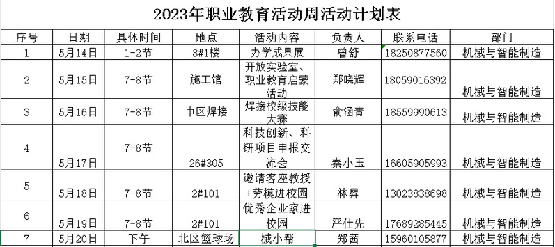 結(jié)合機(jī)械與智能制造學(xué)院實(shí)際工作情況,突出技能大賽的特點(diǎn),開展各種主要活動如下:開展辦學(xué)成果展,開放實(shí)驗(yàn)室、職業(yè)教育啟蒙活動,焊接校級技能大賽,科技創(chuàng)新、科研項(xiàng)目申報交流會,邀請客座教授+勞模進(jìn)校園,優(yōu)秀企業(yè)家進(jìn)校園和械小幫等活動。