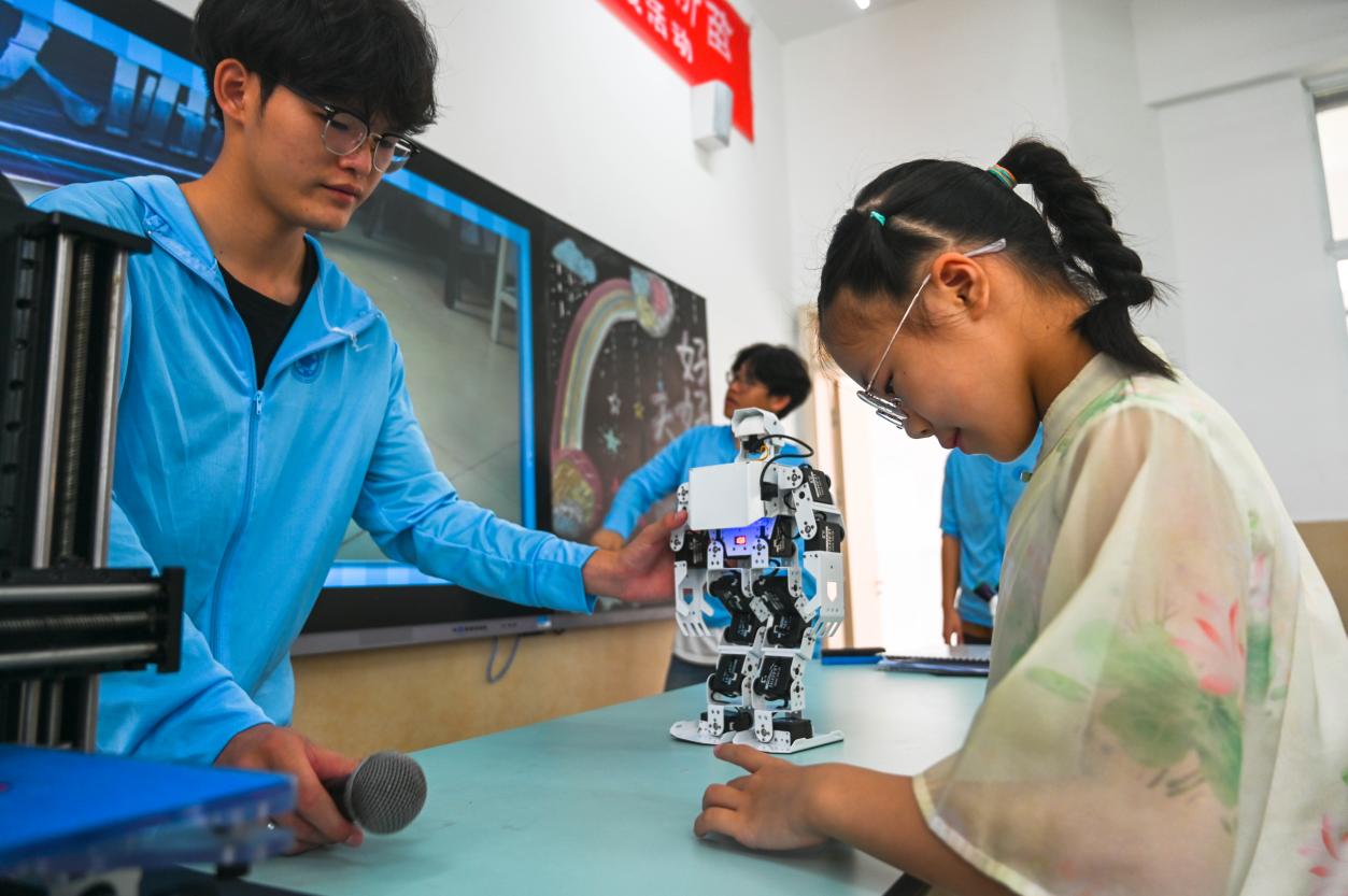 (小朋友在實踐團成員的幫助下學習操作人形機器人)