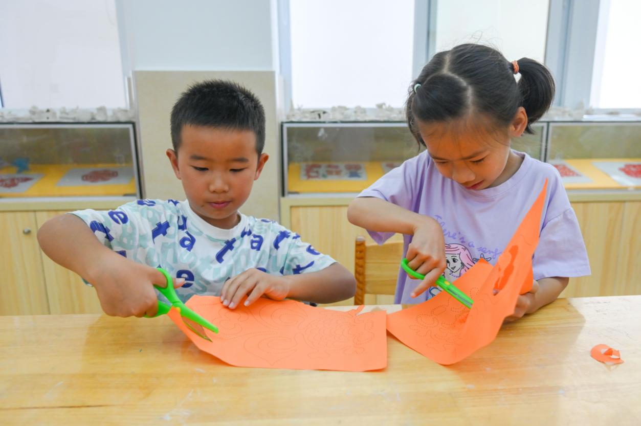 在橙色育美課堂中,實踐團巧妙融合學院深厚的藝術傳統(tǒng),精心打造了一系列啟迪童心、傳承文化的非遺體驗與創(chuàng)意手工活動,讓傳統(tǒng)文化在指尖流轉(zhuǎn),藝術之美浸潤心田?!昂材h香”環(huán)節(jié),實踐團教孩子們執(zhí)筆運腕,在墨香中感受筆畫的舒展遒勁,觸摸漢字風骨。“柘榮非遺剪紙”里,孩子們聽民俗故事、學剪法,紅紙上綻放的鏤空圖案,傳遞著鄉(xiāng)土智慧與吉祥寓意?!疤胀辽ā惫し恢?,孩子們?nèi)嗄筇胀了苄?,在實踐團講解中感受陶藝傳承,領悟“百煉方成器”的哲思。而作為課堂重頭戲的“非遺蠶絲扇”制作,更是讓孩子們沉醉其中:實踐團先講述蠶絲扇的千年傳承,從蠶桑養(yǎng)殖到蠶絲織造,再到扇面繪制的獨特技藝?!爸窬幃嫛本幙椛钋伤?。孩子們在實踐中觸碰文化肌理,激發(fā)創(chuàng)造潛能,心靈被傳統(tǒng)文化滋養(yǎng)得澄澈動人。