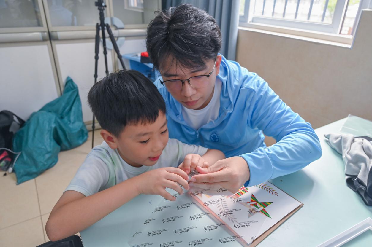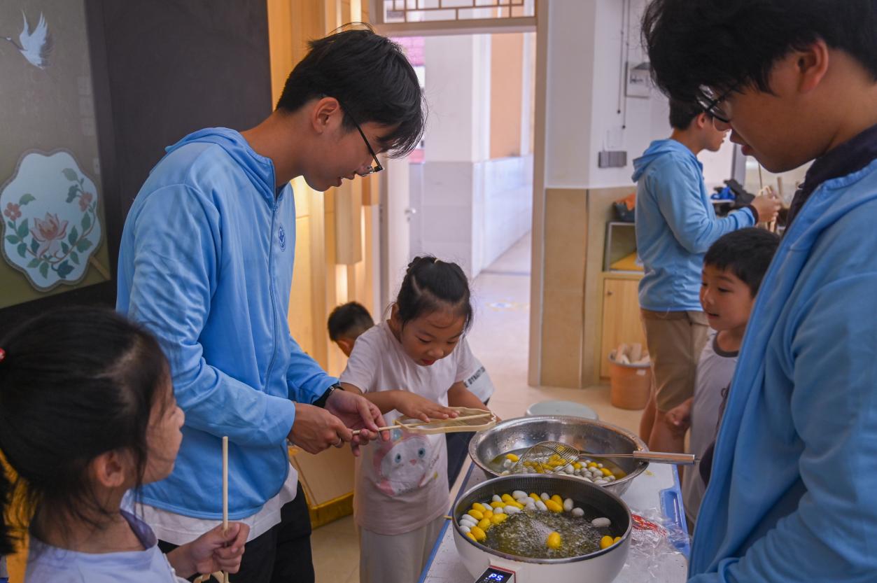 (實踐團成員給小朋友們上非遺蠶絲扇課堂)