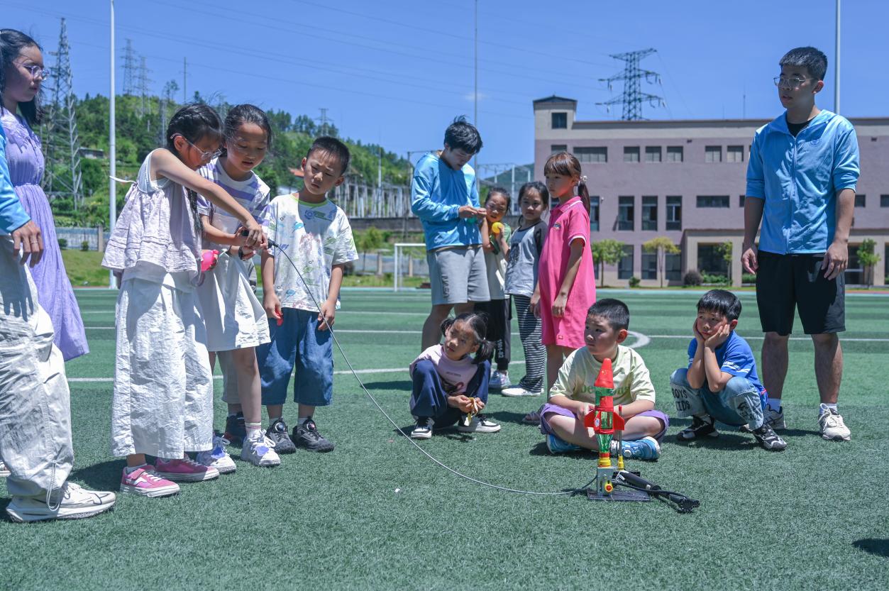 (實踐團成員指導小朋友們制作火箭發(fā)射器)
