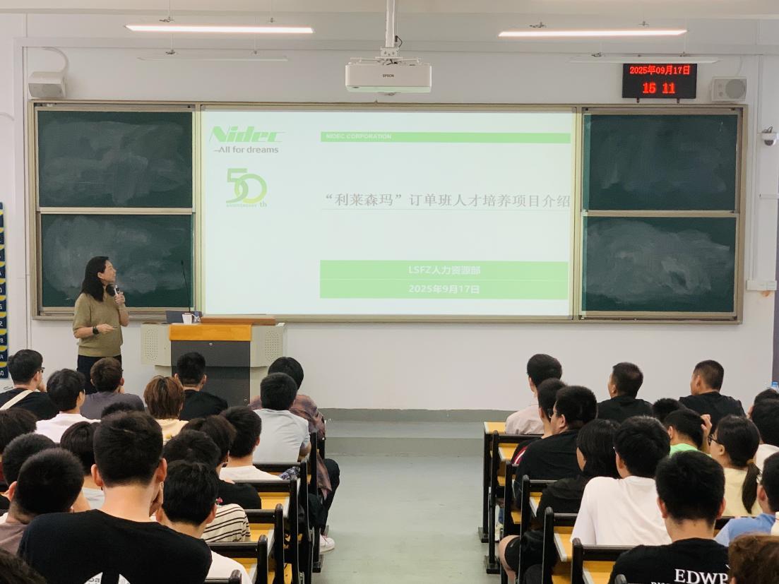 訂單班合作企業(yè)-利萊森瑪電機(jī)科技(福州)有限公司企業(yè)人事經(jīng)理代表企業(yè)上臺(tái)發(fā)言。其先是介紹了企業(yè)的發(fā)展歷程、行業(yè)地位與核心業(yè)務(wù),讓新生對(duì)合作企業(yè)有了全面了解;接著,重點(diǎn)解讀了電氣專業(yè)訂單班的培養(yǎng)體系,包括“校企共同制定人才培養(yǎng)方案”“學(xué)生進(jìn)入企業(yè)實(shí)習(xí)實(shí)訓(xùn)”等特色環(huán)節(jié),清晰展現(xiàn)了訂單班“工學(xué)結(jié)合、精準(zhǔn)育人”的優(yōu)勢(shì),為新生提供了一條“入學(xué)即接軌職場(chǎng)”的成長(zhǎng)通道。