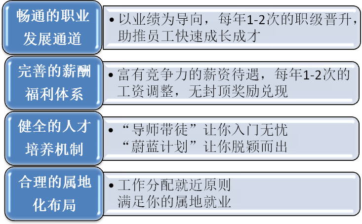 培訓(xùn)培養(yǎng) | 入職培訓(xùn)、導(dǎo)師帶徒、蔚藍(lán)計劃、e-Learning網(wǎng)絡(luò)學(xué)習(xí)、內(nèi)部培訓(xùn)、外送培訓(xùn)等 | |
