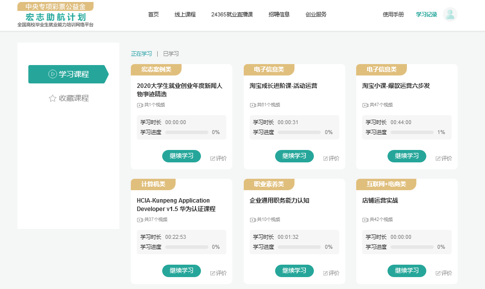 點(diǎn)擊右上角“學(xué)習(xí)記錄”,可以查看正在學(xué)習(xí)/已學(xué)習(xí)、收藏的課程。學(xué)習(xí)進(jìn)度超過(guò)20%,可對(duì)課程做出評(píng)價(jià)。