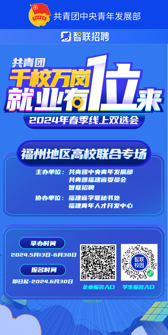 為深入貫徹團(tuán)中央促進(jìn)大學(xué)生就業(yè)行動(dòng),切實(shí)為畢業(yè)生提供就業(yè)崗位信息、暢通求職渠道、為用人單位和畢業(yè)生搭建供需橋梁,幫助促進(jìn)高校畢業(yè)生更加充分更高質(zhì)量就業(yè)。現(xiàn)舉辦“千校萬崗 就業(yè)有位來”2024年福州地區(qū)高校畢業(yè)生春季聯(lián)合專場(chǎng)線上招聘會(huì),重點(diǎn)面向福州、莆田2024屆及往屆未就業(yè)所有高校畢業(yè)生,誠邀各用人單位及畢業(yè)生報(bào)名參會(huì)。現(xiàn)將有關(guān)事項(xiàng)函告如下: