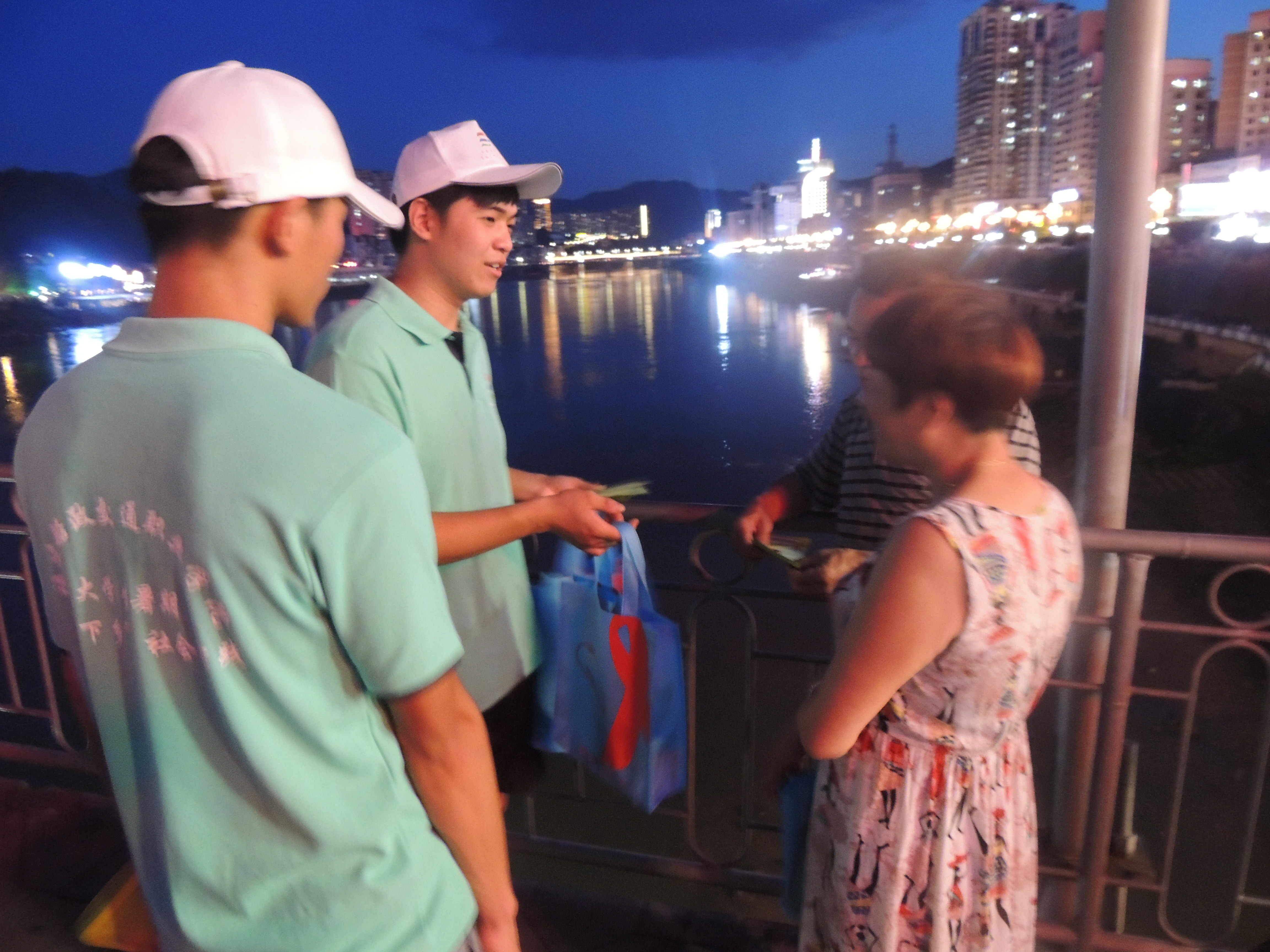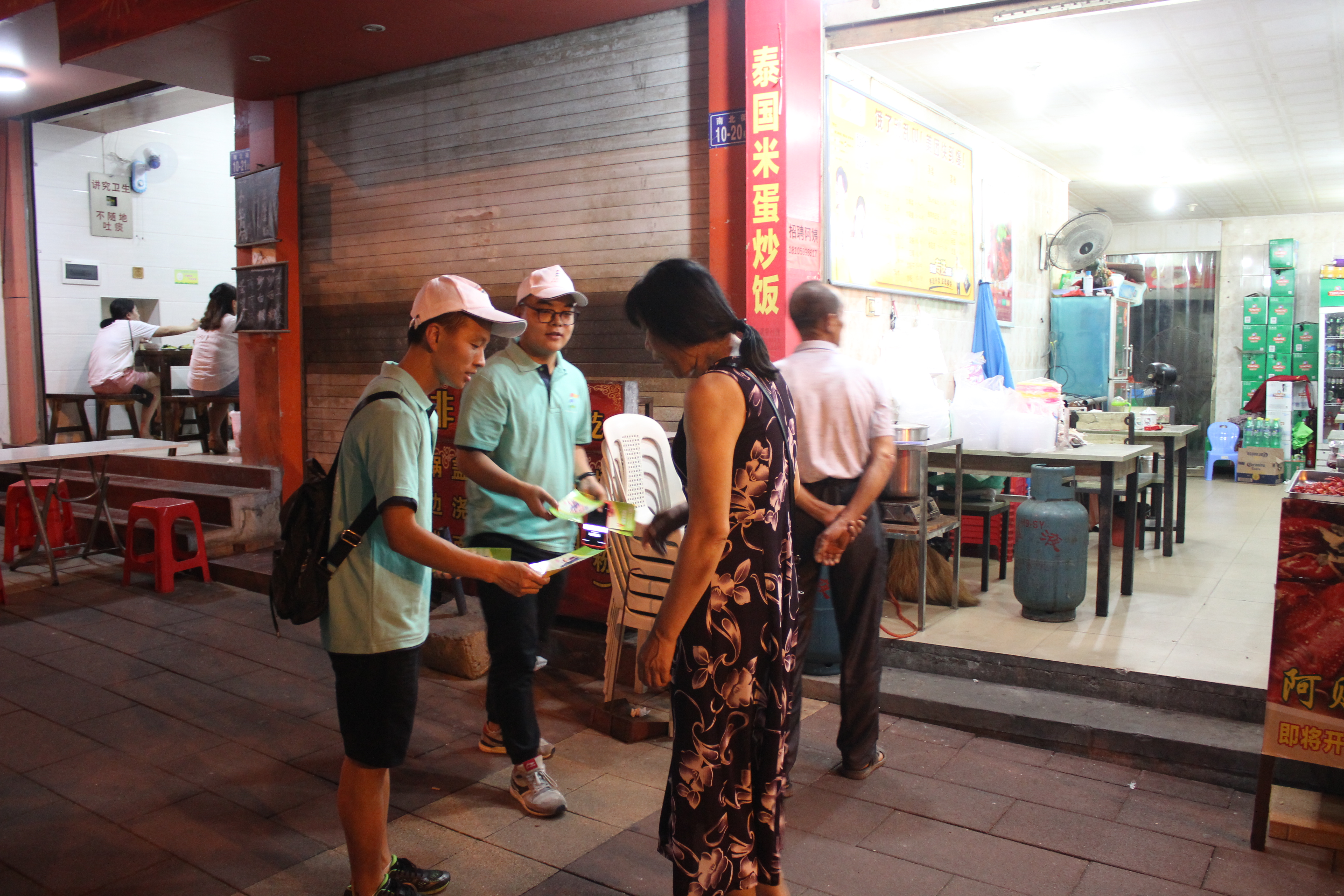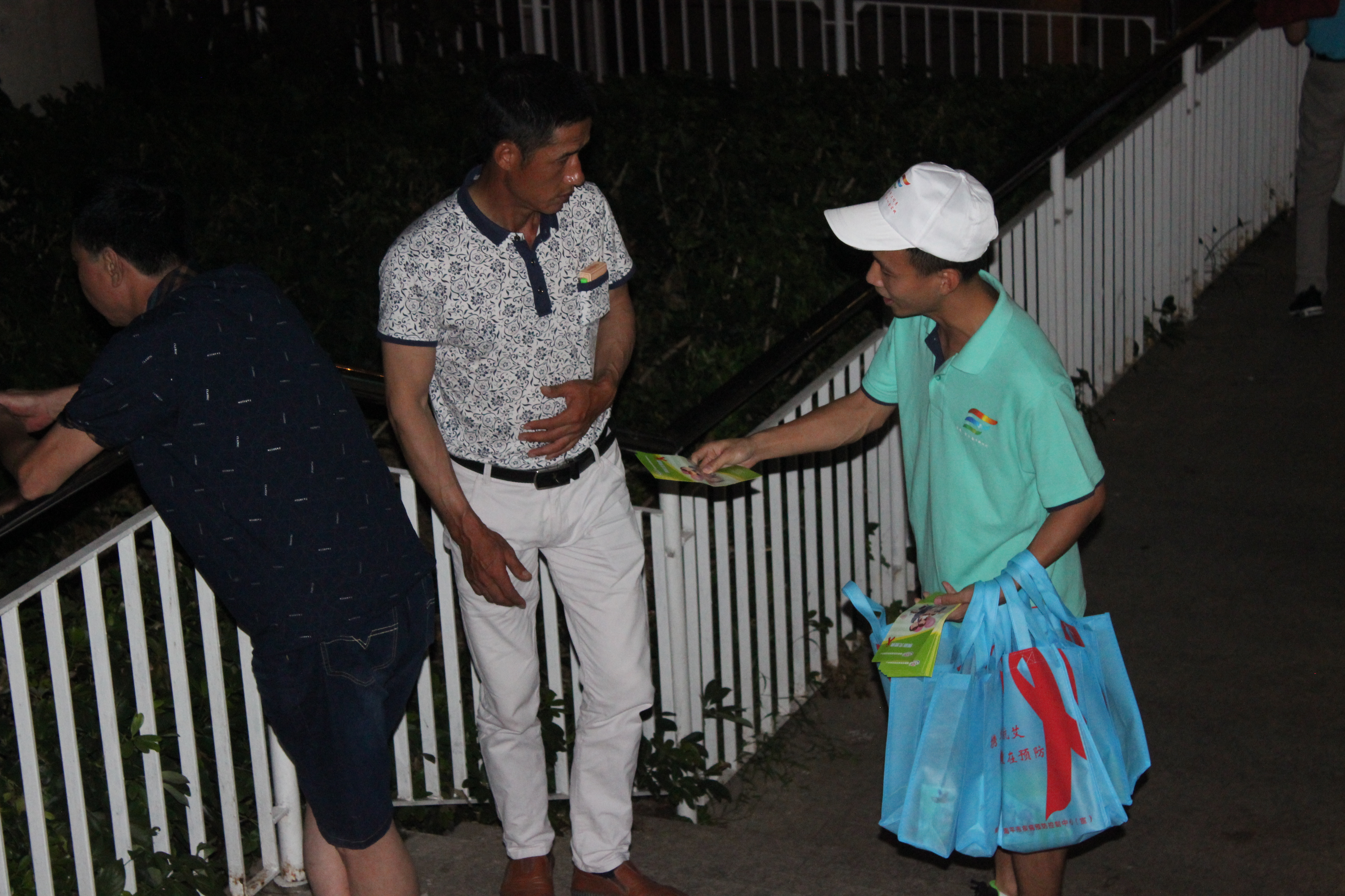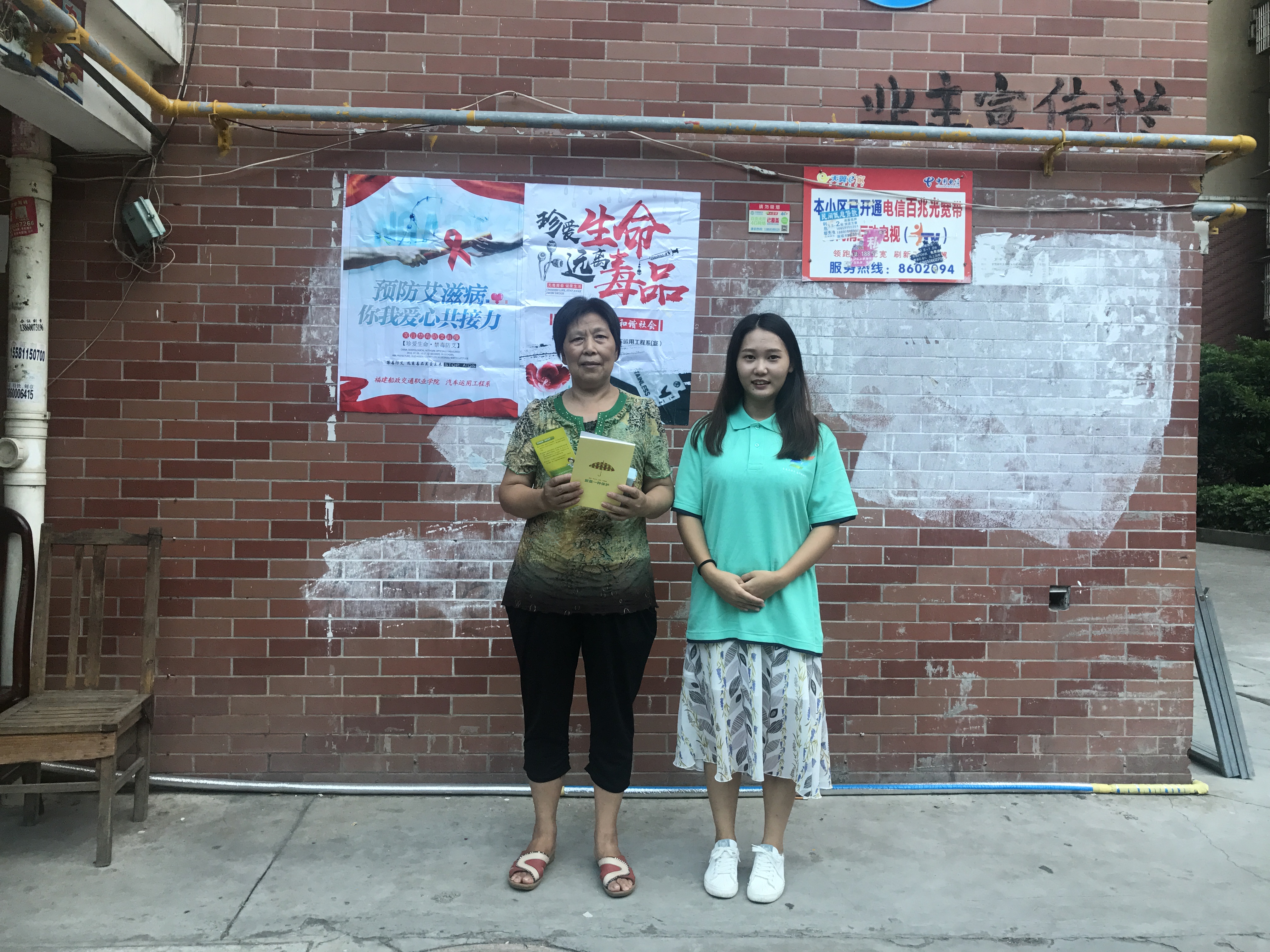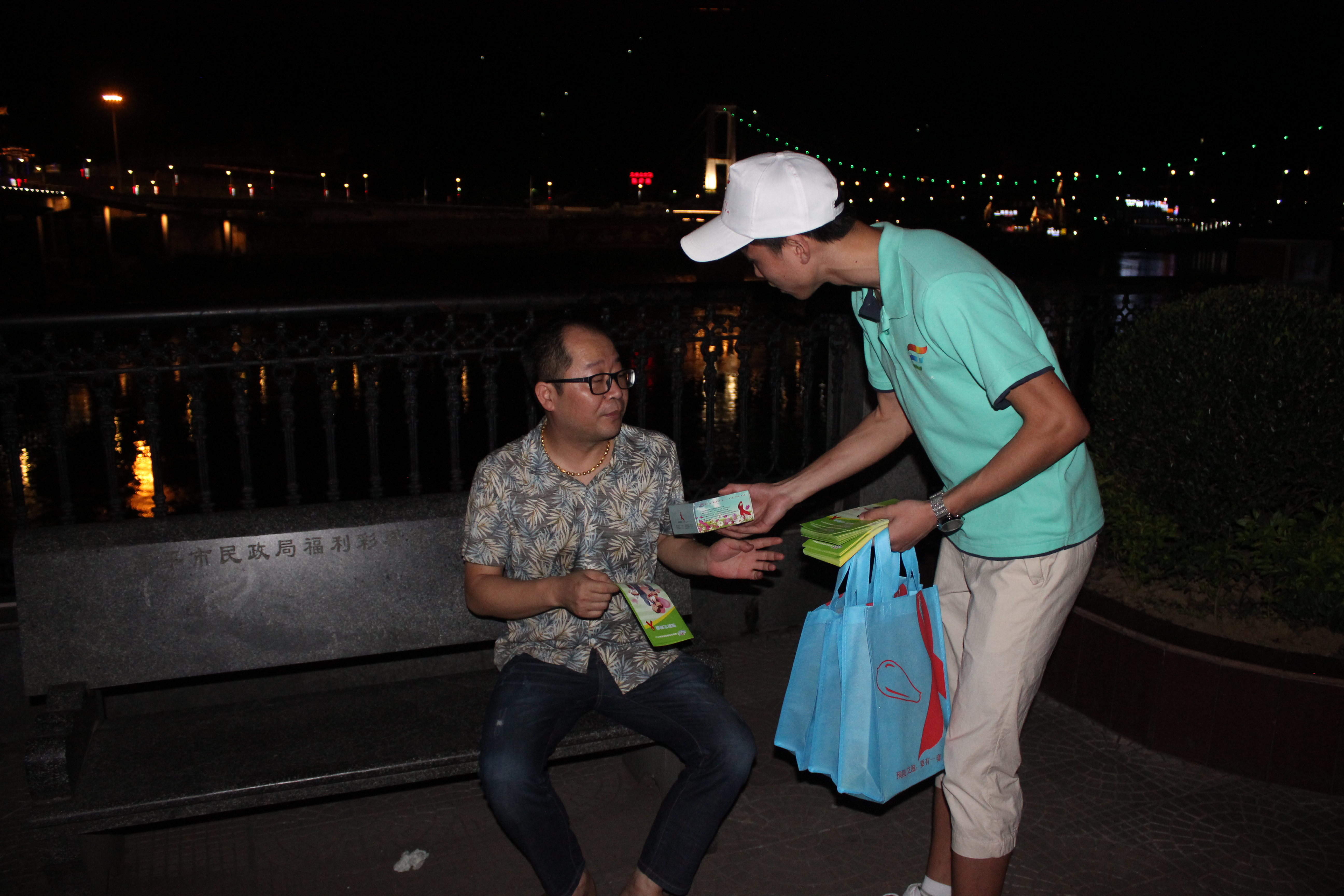 7月9日當天并同南平市疾病控制中心的科研室主任和數(shù)位醫(yī)師及我們實踐隊領隊沈曉家老師以及實踐團的師生進行多點宣傳。在疾控中心醫(yī)師的防艾知識普及下,我們得知南平市艾滋發(fā)病率多在40歲以上的中老年人,我系宣傳隊根據(jù)這一特點,選擇下午到傍晚在中老年人活動的密集區(qū)的公園、社區(qū)開展禁毒防艾的宣傳活動。