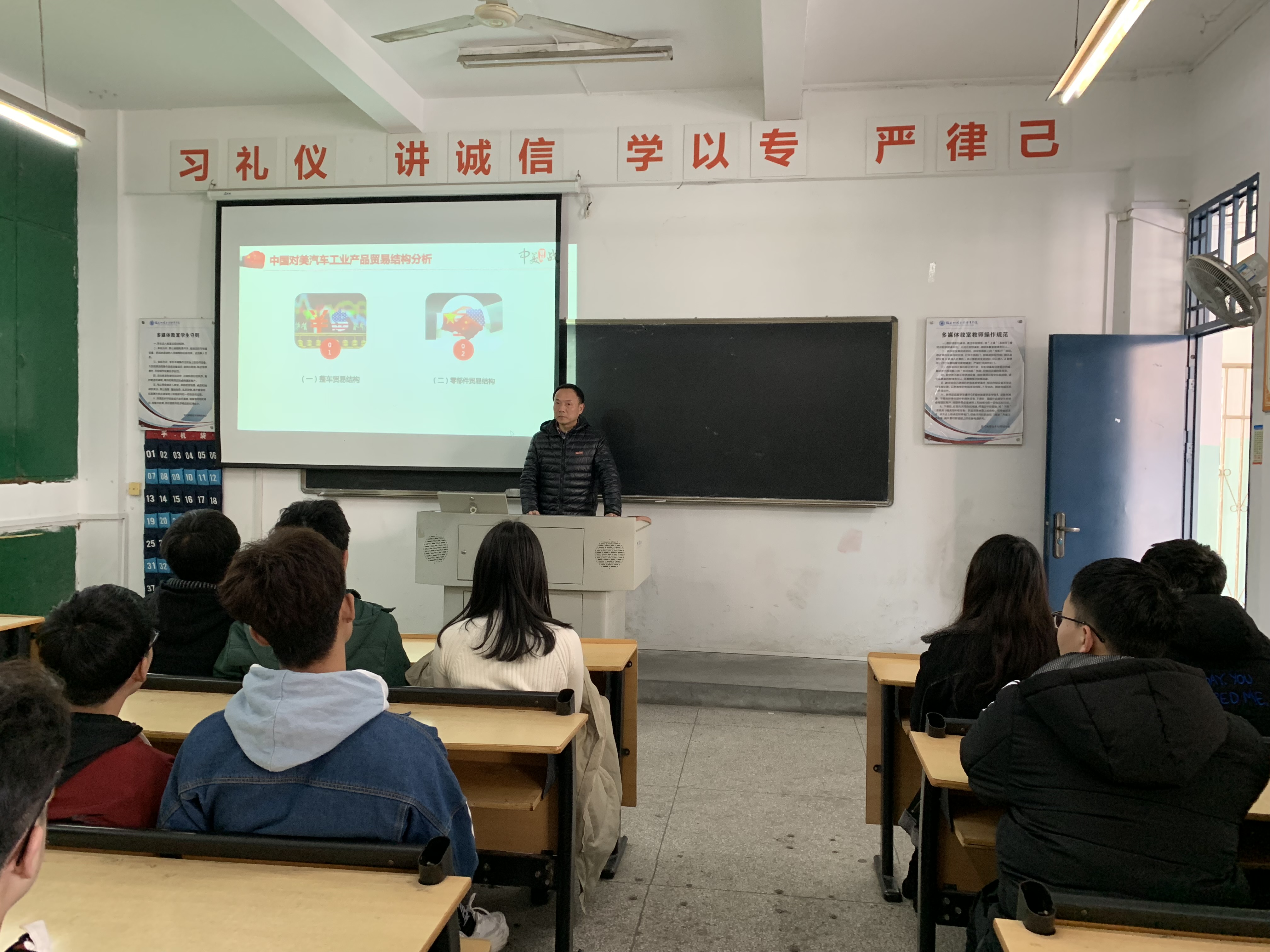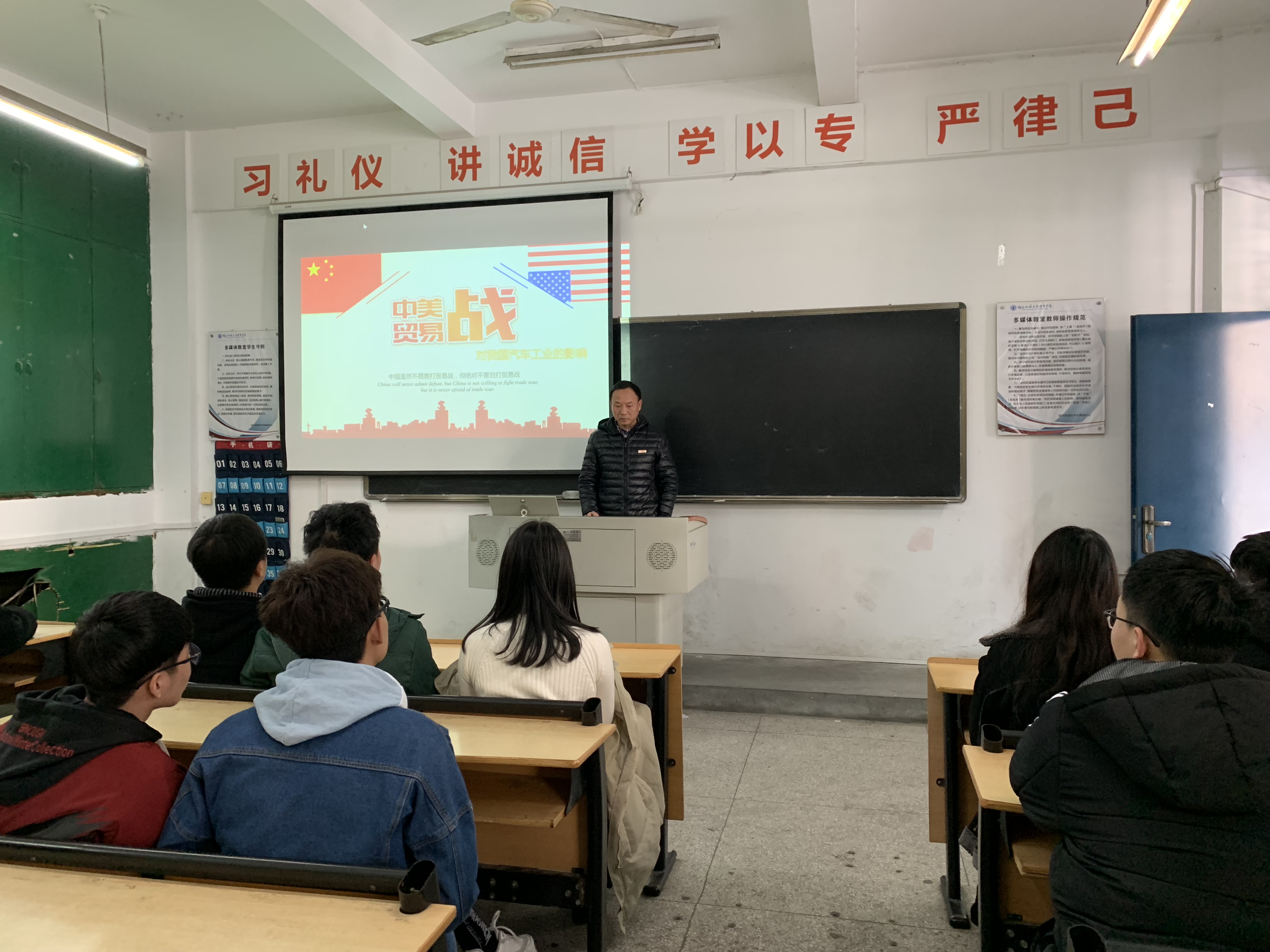 2018年11月30日,張榮貴主任在汽車運(yùn)用工程系22號(hào)樓103教室進(jìn)行了以“中美貿(mào)易摩擦對(duì)我國(guó)汽車工業(yè)的影響”為主題的報(bào)告。參加了此次形勢(shì)與政策講座的有汽車系教工黨員代表以及各班班長(zhǎng)、團(tuán)支書和優(yōu)秀學(xué)生代表。