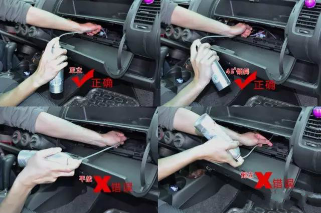 2)空調(diào)管道清洗:正式清洗前將空調(diào)清洗劑搖勻,并將包裝內(nèi)的軟管套上,接著將空調(diào)的風(fēng)量開到最大并且調(diào)整到外循環(huán)模式。但是不要打開空調(diào)壓縮機(A/C按鈕處于關(guān)閉狀態(tài))。將已經(jīng)搖勻的清洗劑噴對準(zhǔn)空調(diào)濾芯的位置進(jìn)行噴射,里面的吸力會將清洗劑吸入,其中特別要注意的是,清洗劑上面的軟管不要靠鼓風(fēng)機太近哦,以免被攪進(jìn)去。