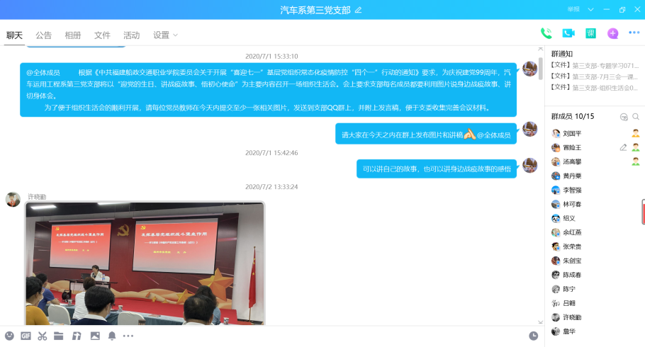 為了保證活動(dòng)的順利舉辦,支委提前利用第三黨支部的QQ群發(fā)布通知,號(hào)召每位黨員同志收集身邊的戰(zhàn)疫故事圖片,發(fā)布到群上。